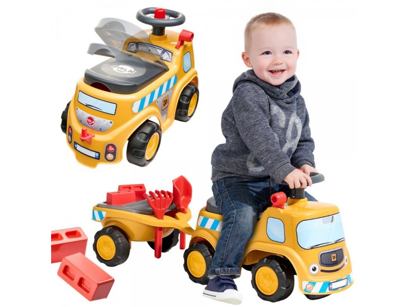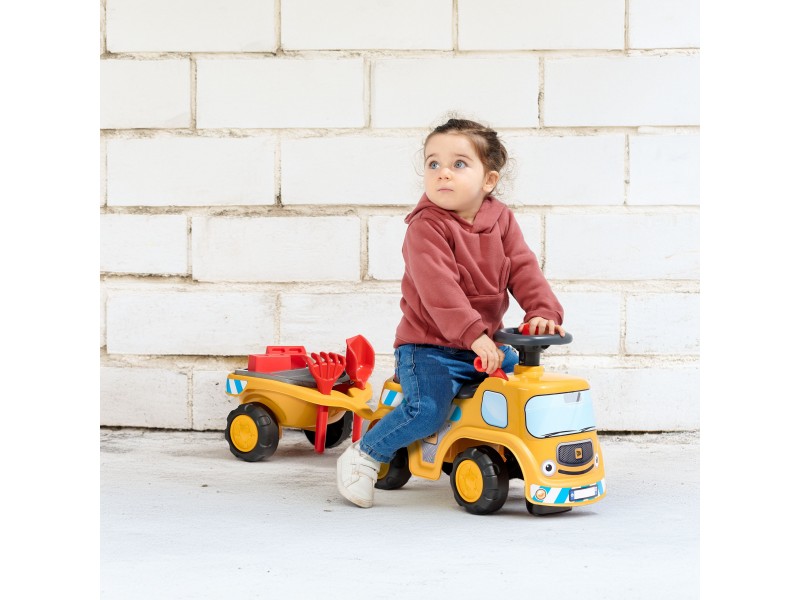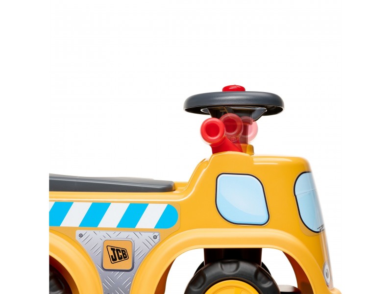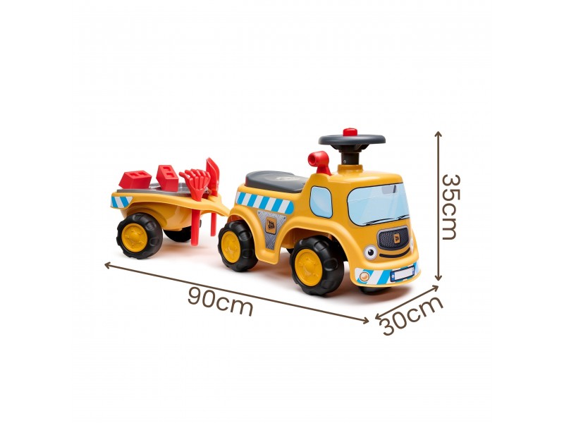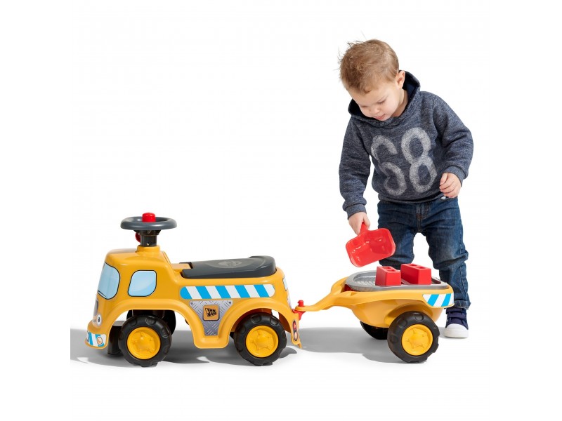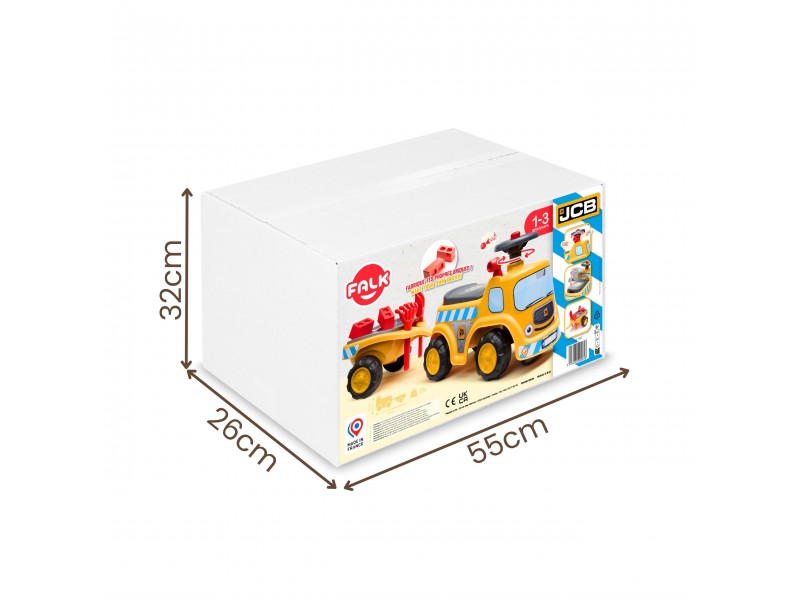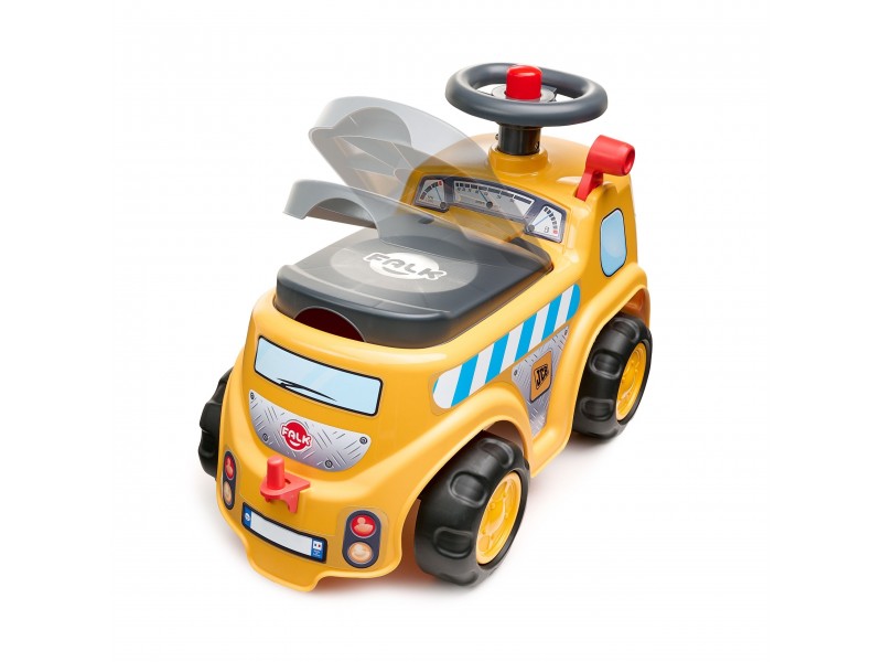 Nėra per didelės statybų aikštelės mažajam inžinieriui, vairuojančiam Falk prekės ženklo JCB statybinį sunkvežimį. Ši tvirta transporto priemonė, 100 % pagaminta Prancūzijoje, sukurta specialiai vaikams nuo 1 iki 3 metų. Tai idealus žaidimų draugas smėlio dėžėje, turintis pridedamą nuimamą priekabą, kurioje telpa būtiniausi mūrininko įrankiai. Paspiriama mašinėlė pasižymi puikiu stabilumu, kas garantuoja mažylio saugumą įgyvendinant didelius statybų projektus. Dėl pasukamo vairo su įmontuotu garso signalu, manevruoti transporto priemone yra paprasta ir intuityvu. Be to, po atidaroma sėdyne slepiasi nedidelė daiktadėžė vaiko lobiams, o gale yra vieta personalizuojamam valstybiniam numeriui, kas leidžia suteikti savivarčiui unikalų charakterį.