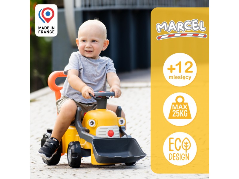 Paspirtukas-ekskavatorius „Marcel“, sukurtas prancūzų gamintojo FALK, yra puiki pirmoji transporto priemonė jūsų mažyliui. Šis kompaktiškas, tačiau tvirtas žaislas su veikiančiu priekiniu kaušu, vairu su garso signalu ir patogia stūmimo rankena kviečia vaikus nuo 12 mėnesių amžiaus leistis į nuotykius tiek namuose, tiek lauke. Stabili konstrukcija ir apgalvotos detalės, tokios kaip spragsintis užvedimo raktelis ir talpi daiktadėžė po sėdyne, kiekvieną pasivažinėjimą pavers smagiu ir lavinančiu žaidimu, kuris sujungia judėjimą su vaidmenų žaidimais.