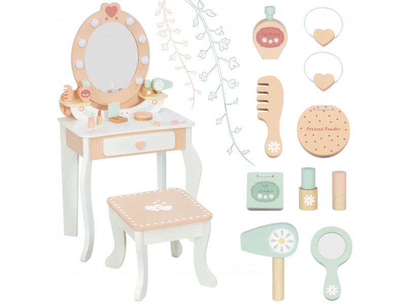 Kiekviena maža mergaitė svajoja apie asmeninį grožio kampelį, kuriame galėtų puoštis ir jaustis ypatinga. Šis „Tooky Toy“ medinis tualetinis staliukas su kėdute ir gausiu priedų rinkiniu yra tobula dovana, skatinanti kūrybiškumą ir pirmuosius savarankiškos priežiūros įgūdžius. Pagamintas iš natūralios medienos ir nudažytas švelniomis pastelinėmis spalvomis, jis sukuria jaukią ir ramią aplinką žaidimams. Staliukas turi medinį veidrodį su integruotu LED apšvietimu, patogų stalčių smulkmenoms ir visą rinkinį žaislinių kosmetikos bei plaukų formavimo priemonių, kurios leis vaiko fantazijai skleistis.
