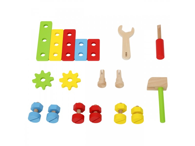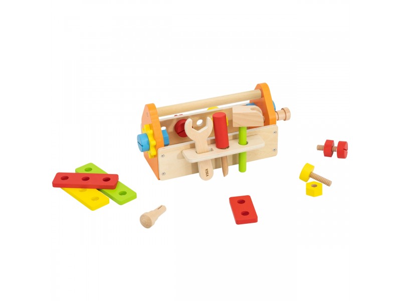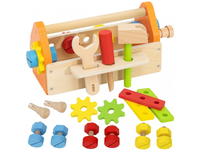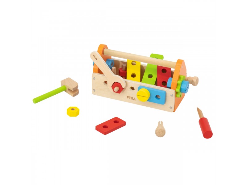 Medinė įrankių dėžė iš „Viga“ „PolarB“ kolekcijos – tai puikus žaislas kiekvienam mažajam meistrui, mėgstančiam kūrybiškus žaidimus. Šis lavinamasis rinkinys suteiks daugybę džiaugsmo ir padės vaikui susipažinti su įvairiais įrankiais bei jų naudojimu. Žaisdami vaikai lavins sukimo, kalimo ir derinimo įgūdžius. Meistravimo žaidimai skatina smalsumą, lavina vaizduotę ir tobulina rankų miklumą.