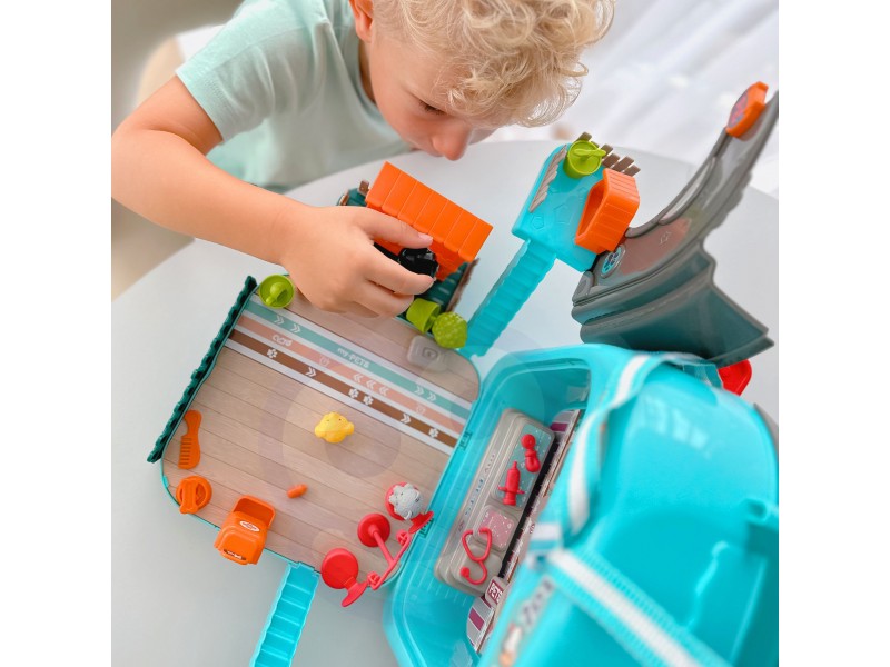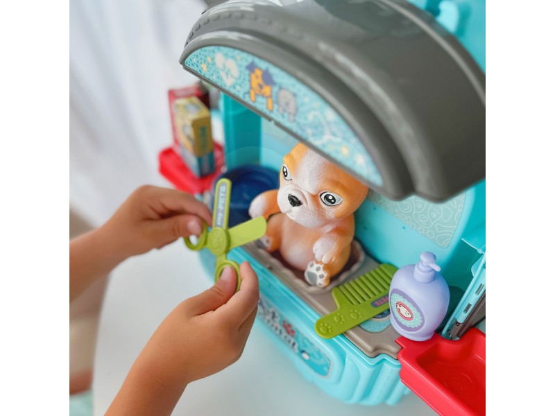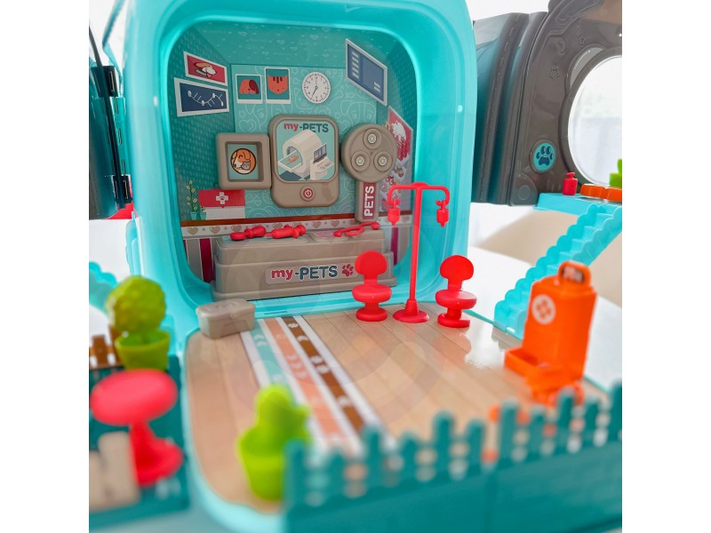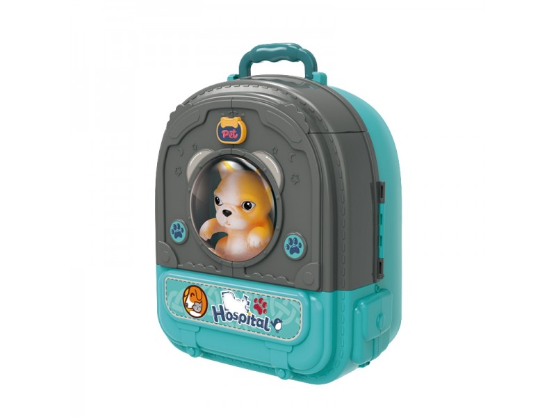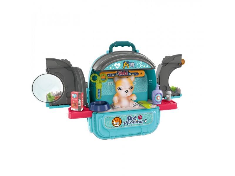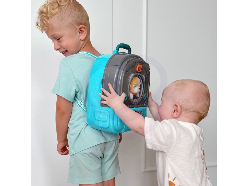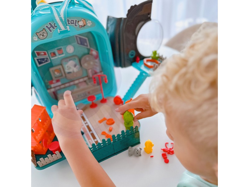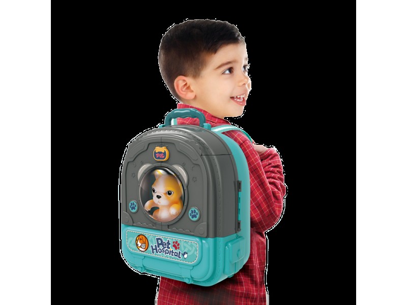 • Žaislas „3in1“: kuprinė, veterinarijos klinika su sodeliu, šuniuko priežiūros vieta.