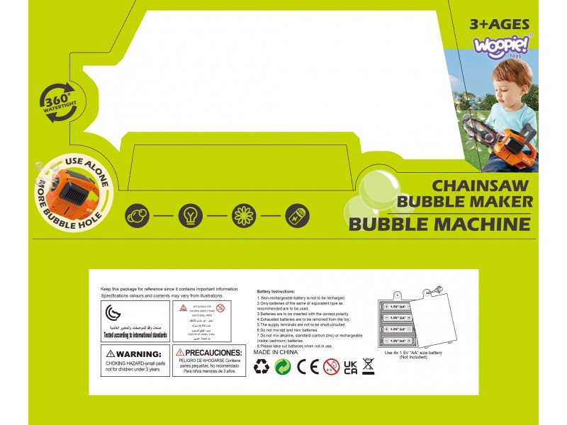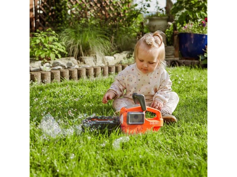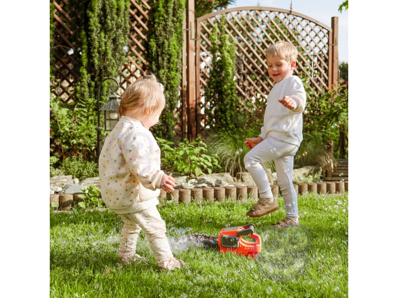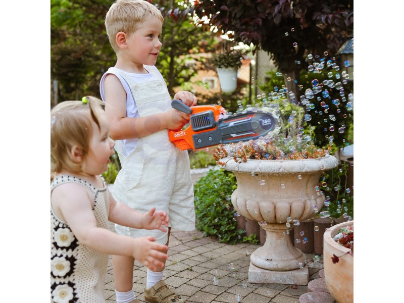 Pjūklo „ašmenų“ antgalis yra nuimamas, o tai reiškia, kad akimirksniu galima transformuoti jį iš grandininio pjūklo į stilingą burbulų pūtimo mašiną. Tikra magija prasideda įjungus pistoletą. Anga, iš kurios skrieja burbulai, ne tik šviečia, bet ir sukasi 360 laipsnių kampu. Šis judėjimas sukuria nuostabų efektą, sustiprina vizualinius potyrius ir priverčia burbulus skrieti į orą pačiomis netikėčiausiomis kryptimis.