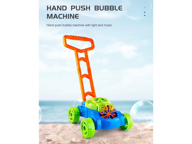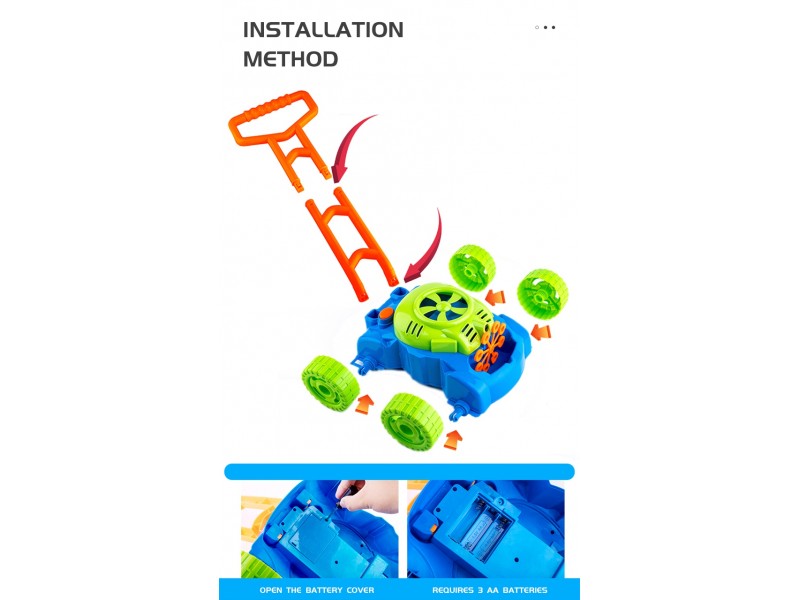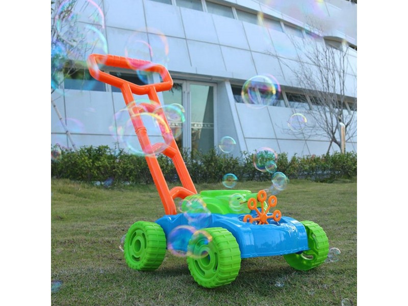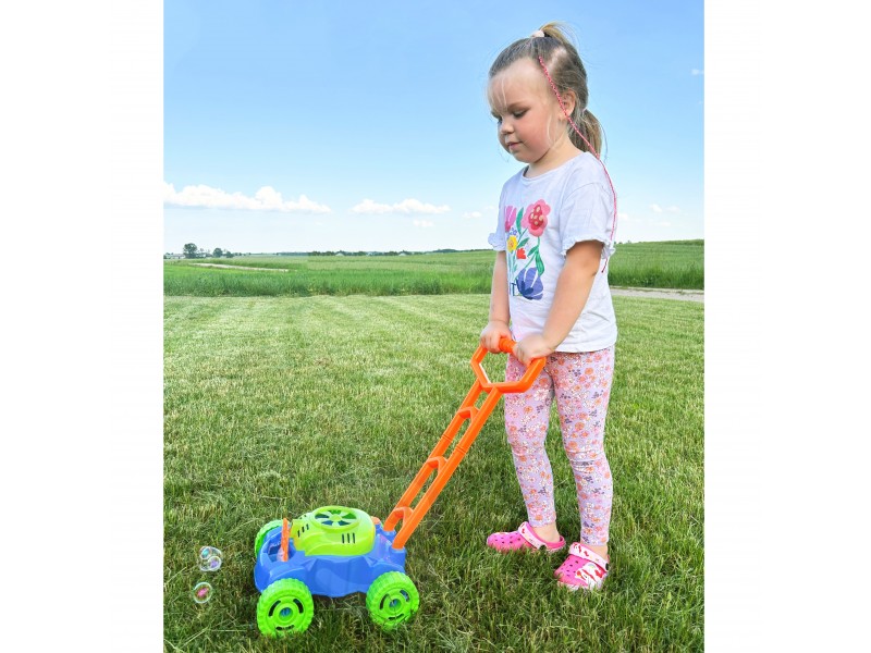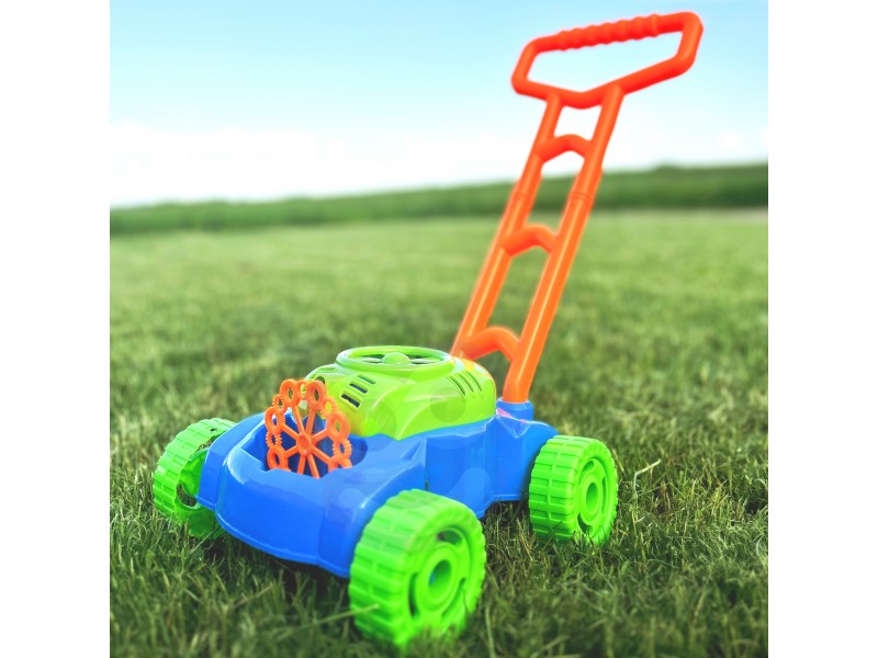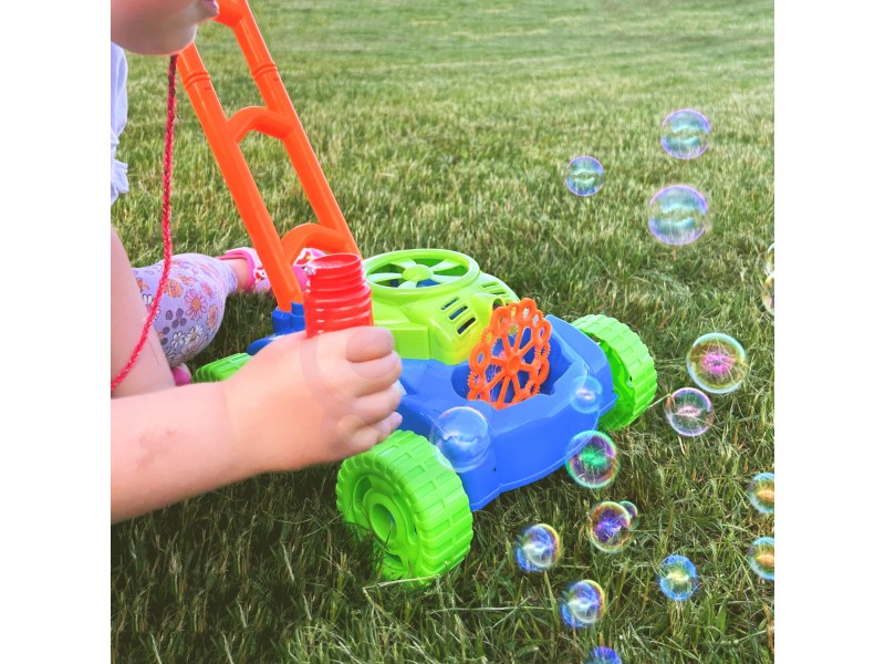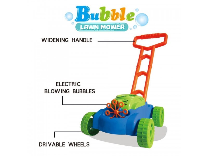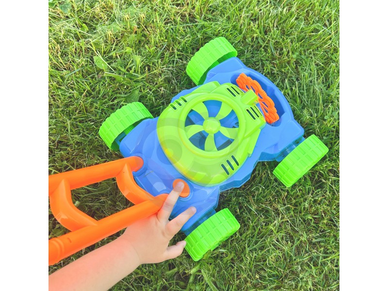 Burbulai pučiami automatiškai. Mažas ventiliatorius, esantis viršutinėje vejapjovės variklio korpuso dalyje, sukuria oro srautą, kuris nukreipiamas į 8 besisukančius žiedus. Jie panyra į talpyklą su skysčiu burbulams gaminti ir paeiliui pasislenka po mažu purkštuku. Tokiu būdu burbulai pučiami nuolatos. Dėl 8 žiedų žaislas vienu metu pagamina didelį kiekį burbulų. Papildomas vejapjovės privalumas yra jos skleidžiami garsai. Girdimi garsai: burbulų pūtimo garsas ir melodija. Prie galinių ratų yra įtaisyti plastikiniai liežuvėliai, kurie važiuojant tarška, taip imituodami tikro prietaiso skleidžiamą garsą. Pasakiškai spalvinga vejapjovė – tai nesibaigiančių pramogų pasiūlymas, skatinantis kūrybiškumą ir lavinantis rankų įgūdžius. Galite būti tikri, kad mažylis neturės laiko nuobodžiauti.
