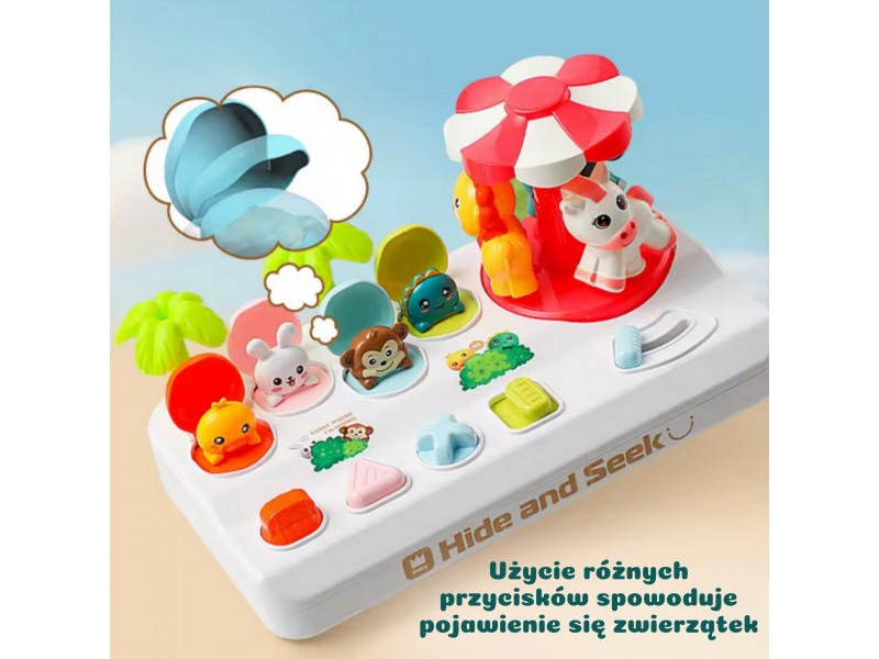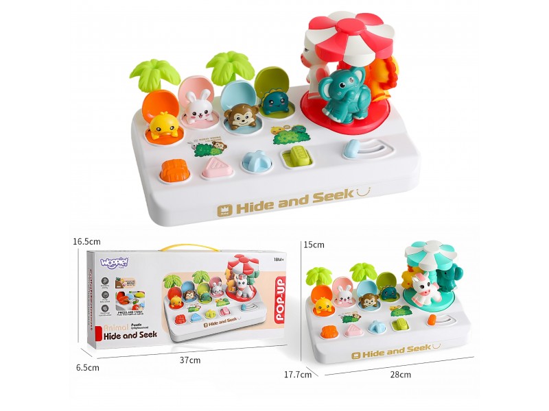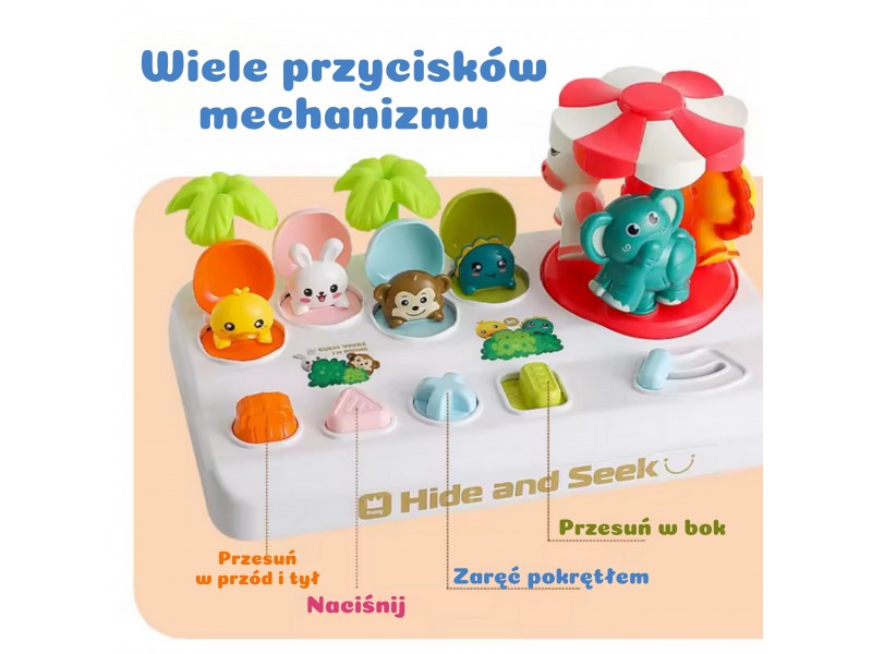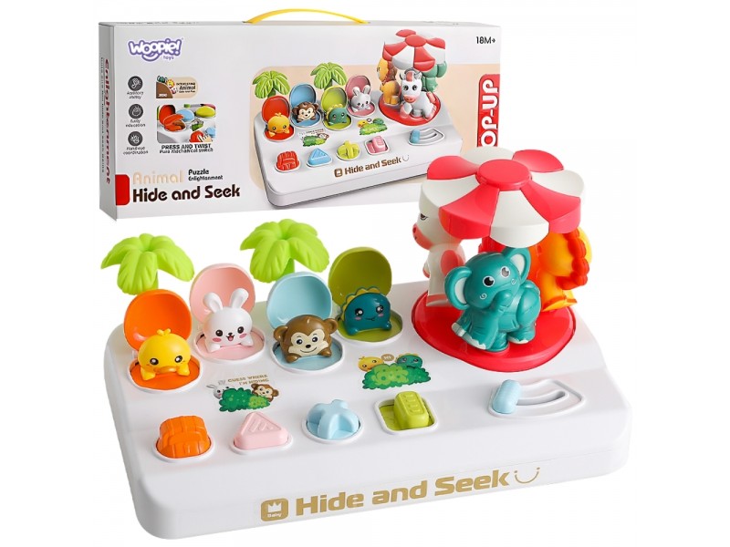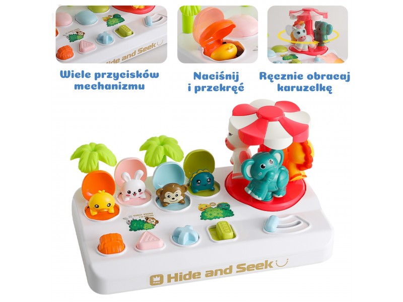 Rinkinį sudaro keturi mieli gyvūnėliai, pasislėpę po spalvingais dangteliais. Kiekvienas gyvūnėlis iššoka iš savo slėptuvės, kai mažylis aktyvuoja skirtingą mechanizmą – paspaudžia, pasuka ar pastumia atitinkamą mygtuką. Šalia įrengta besisukanti karuselė su dar trimis gyvūnėliais, kurią galima įsukti patraukus svirtelę. Šios įvairios interakcijos moko vaiką priežasties ir pasekmės ryšio, stiprina koncentraciją bei lavina rankų judesius ir koordinaciją. Žaidimas ne tik įtraukia, bet ir padeda atpažinti formas bei spalvas – kiekvienas mygtukas yra unikalios formos (žvaigždė, trikampis, kvadratas) ir atitinka konkretų gyvūnėlį, taip skatinant loginį mąstymą.