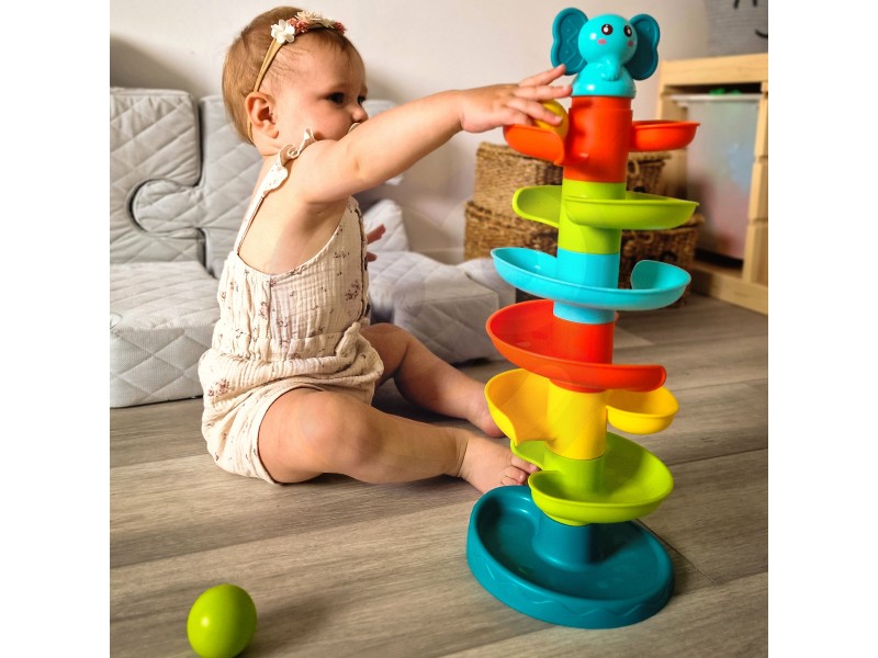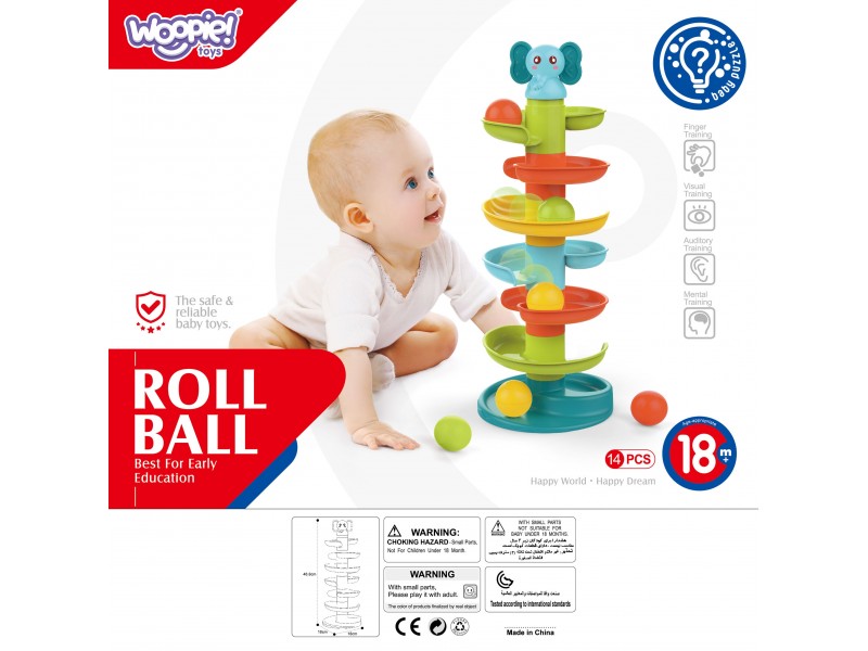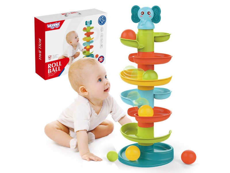 „Woopie“ kamuoliukų trasa – tai spalvingas spiralinis bokštas, garantuojantis begalinį džiaugsmą mažiesiems. Šį rinkinį sudaro 8 spalvotos dalys, kurias mažylis gali lengvai sudėti vieną ant kitos, statydamas aukštą bokštą. Paleisti nuo paties viršaus, kamuoliukai spirale rieda žemyn iki pat apačios, prikaustydami vaiko dėmesį. Rinkinyje yra 3 lengvi ir mažoms rankytėms patogūs suimti kamuoliukai, kurie riedėdami skleidžia garsą, veikdami kaip barškutis. Žaislo dydis idealiai pritaikytas patiems mažiausiems, o žaidimo procesas efektyviai padeda lavinti akių-rankų koordinaciją.