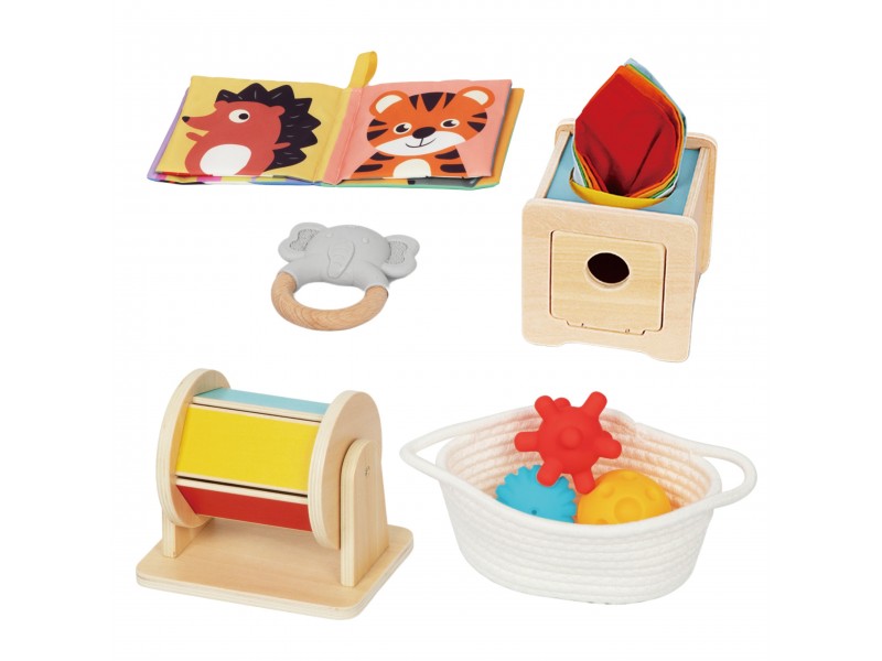 - Sudėtyje yra 5 jutiminiai ir lavinamieji žaislai.
