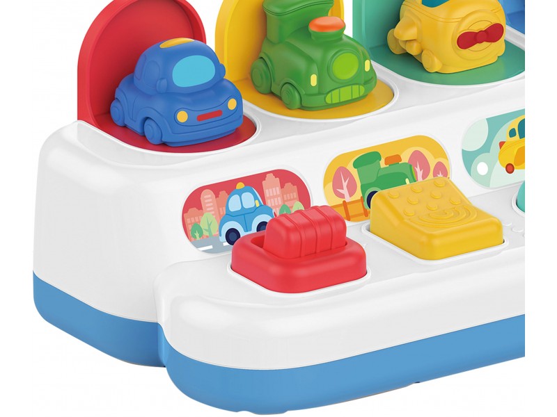 - Interaktyvus veikimas su „pop-up“ mechanizmu (automobiliai iššoka perjungus svirtelę ar paspaudus mygtuką).