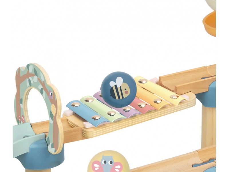 - Muzikiniai elementai – integruotas mini instrumentas (ksilofonas) leidžia vaikui girdėti garsus, kai rieda kamuoliukai, praturtindamas žaidimo patirtį.