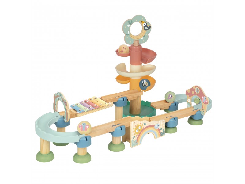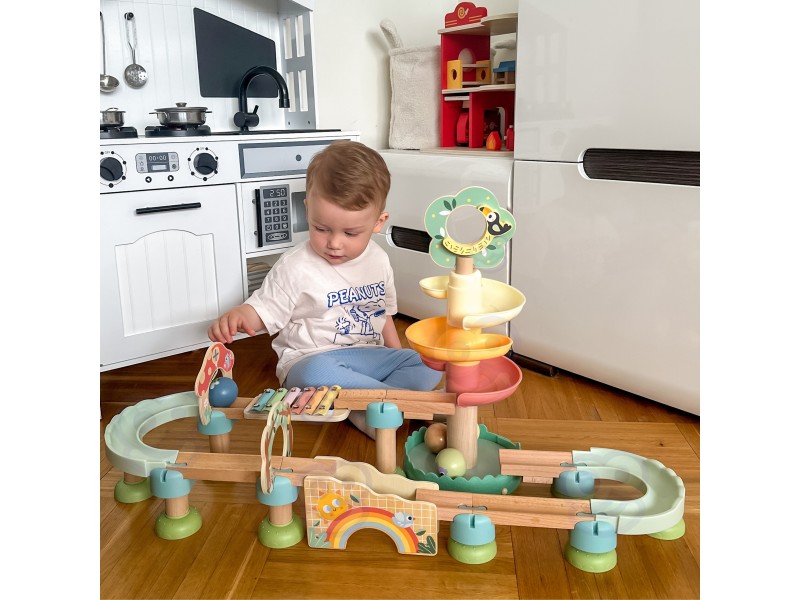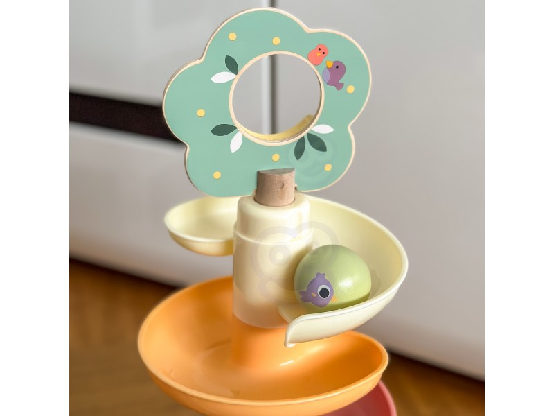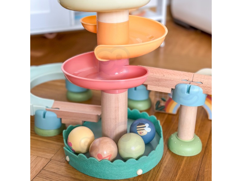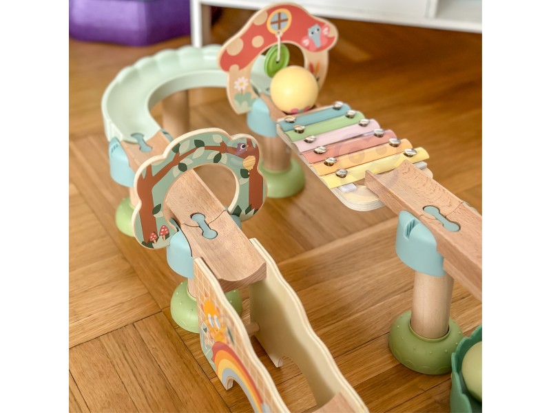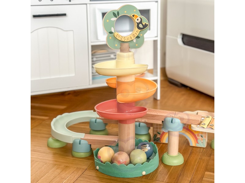 - Spalvinga kamuoliukų trasa su daugybe posūkių supažindins vaiką su judesio ir gravitacijos pasauliu.
