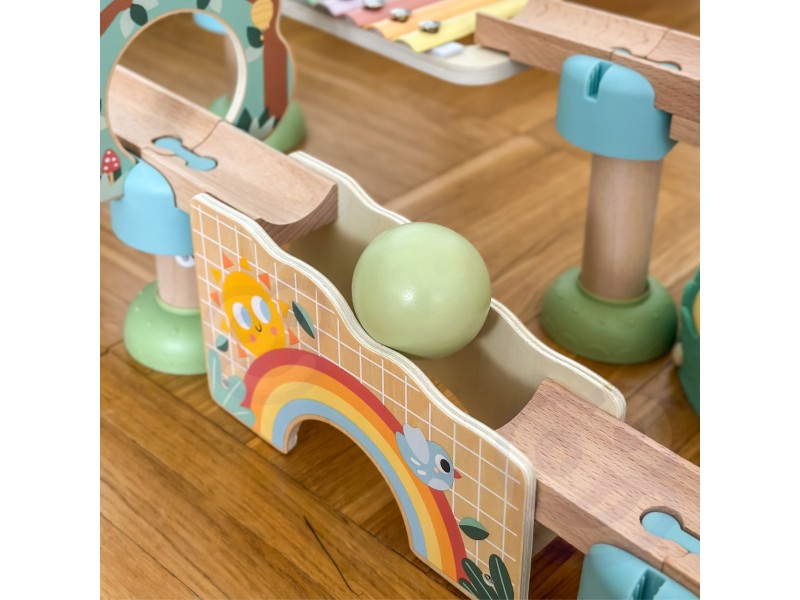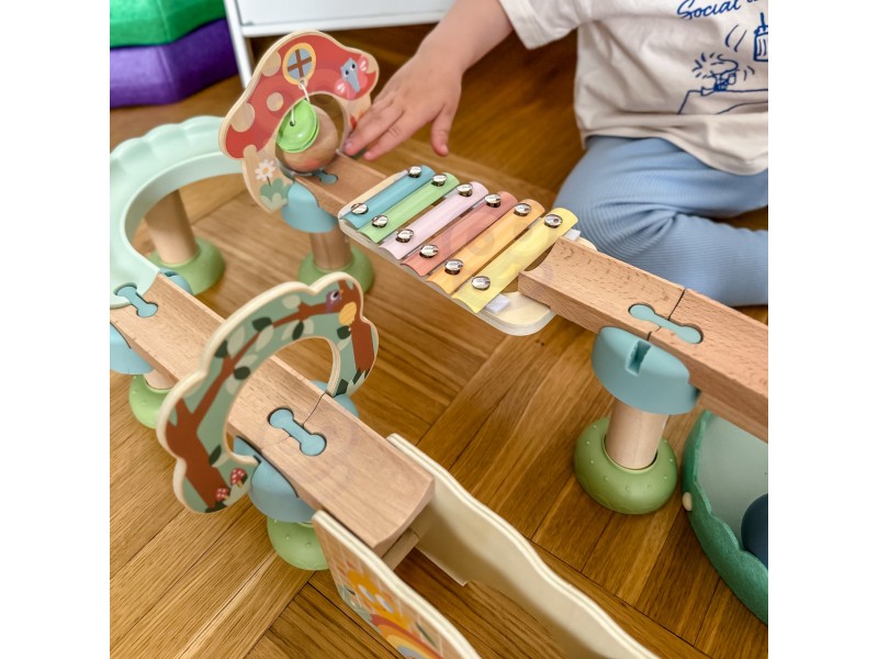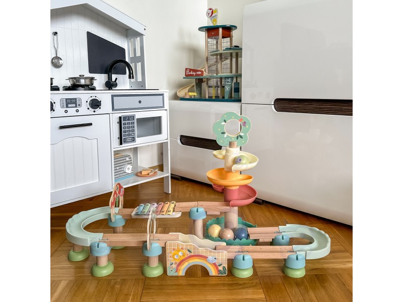 Nuostabi medinė kamuoliukų trasa iš „Woopie Green“ serijos yra išskirtinis žaislas, sujungiantis judesį, garsą ir mokymąsi per žaidimą. Tai puikus rinkinys patiems mažiausiems pasaulio atradėjams, kurie su džiaugsmu stebės, kaip spalvingi kamuoliukai rieda trasa, išjudindami įvairius elementus ir skleisdami malonius garsus. Visas žaislas pasižymi pastelinėmis, akiai maloniomis spalvomis, kurios patraukia dėmesį ir sukuria šiltą, ramią žaidimo atmosferą. Žaislas žavi ne tik savo išvaizda, bet ir funkcionalumu bei kokybe – jis sukurtas atsižvelgiant į vaiko raidą nuo pat ankstyvo amžiaus.