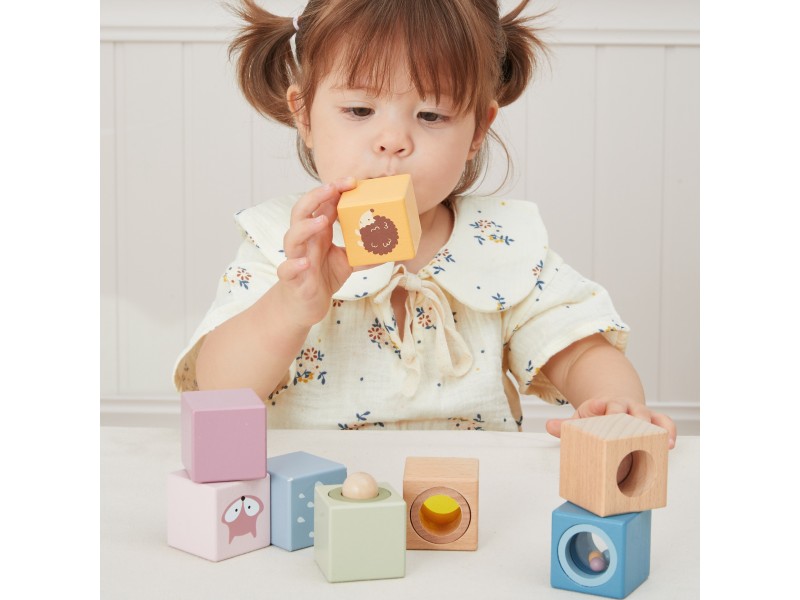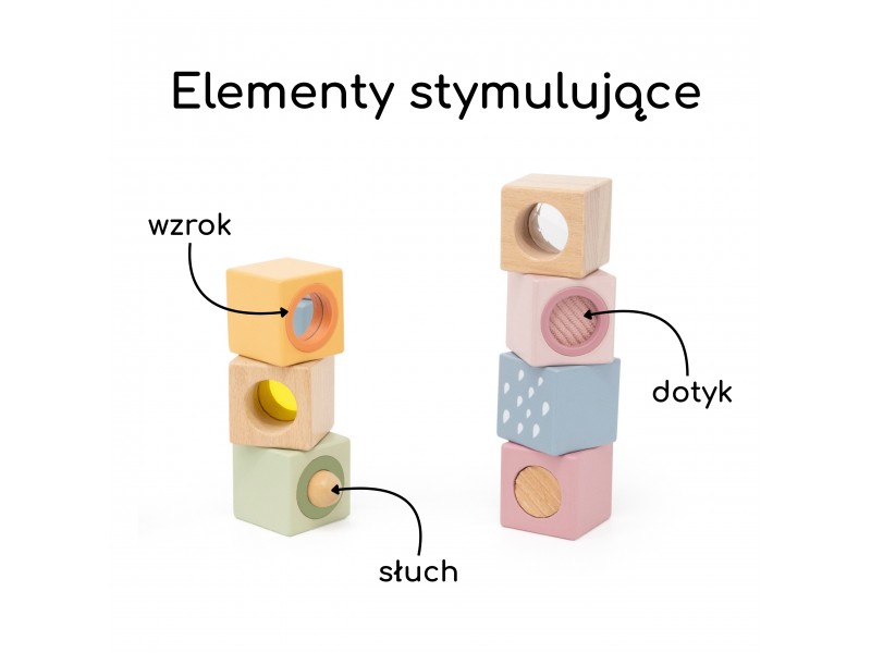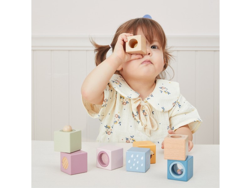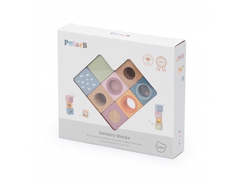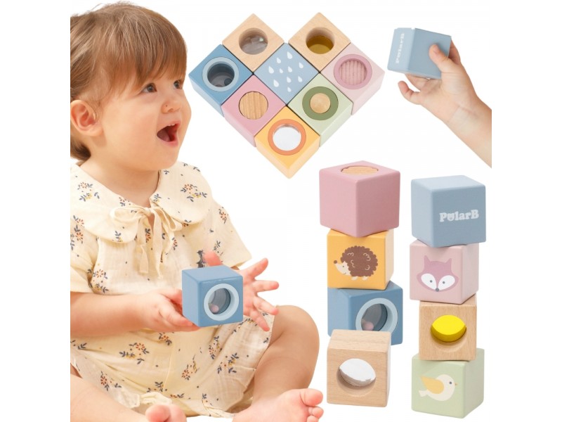 Atraskite nesibaigiančių linksmybių ir atradimų pasaulį su šiuo 8 dalių sensorinių medinių kaladėlių rinkiniu. Sukurtos stimuliuoti lytėjimo, regos ir klausos pojūčius, kiekviena kaladėlė yra unikali: su išskirtine tekstūra, veidrodėliu, varpeliu ar barškučiu. Šios kaladėlės yra idealiai pritaikytos mažoms rankytėms, jos yra saugios, patvarios ir estetiško dizaino. Žaislas skatina vaiko sensorinį vystymąsi, smulkiąją motoriką ir lavina vaizduotę.