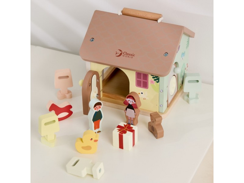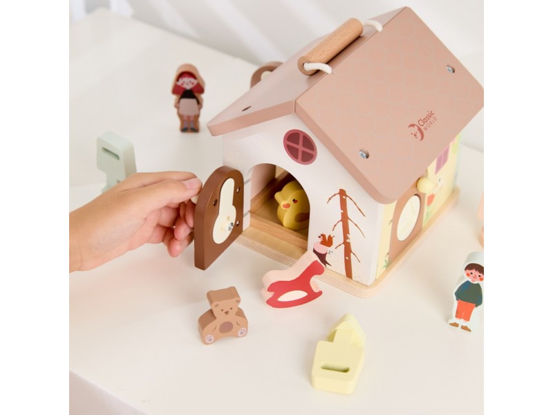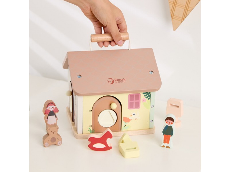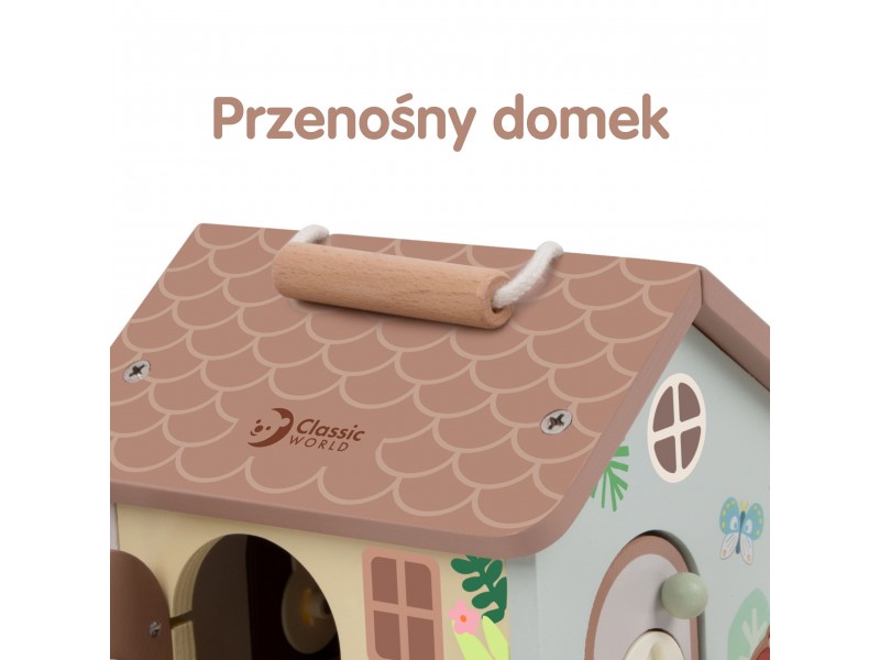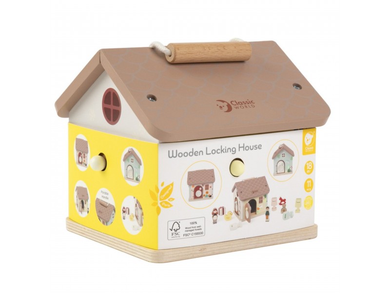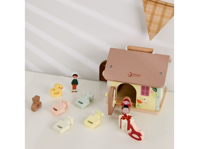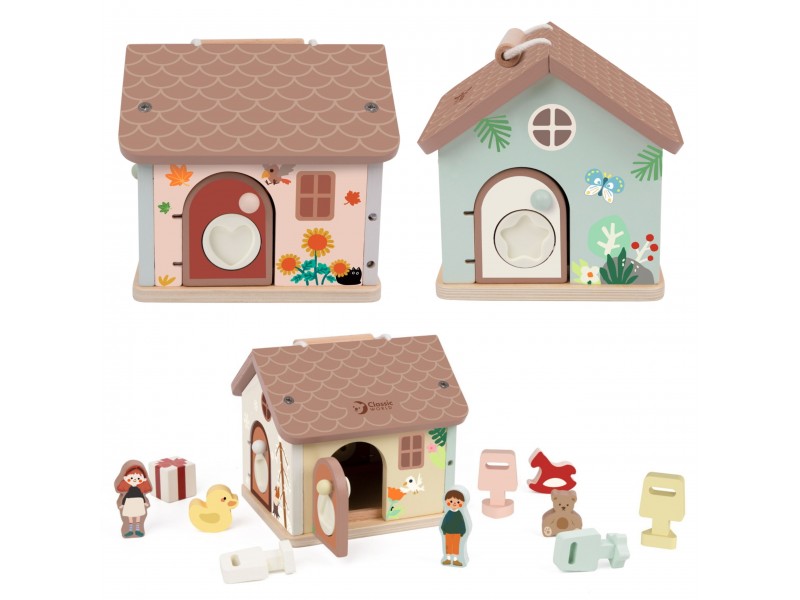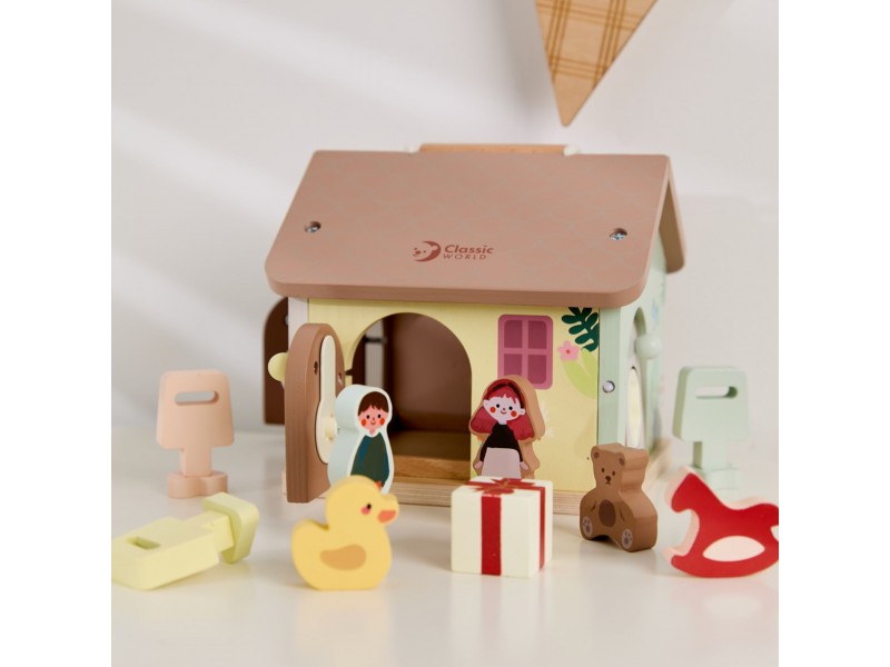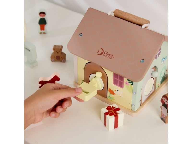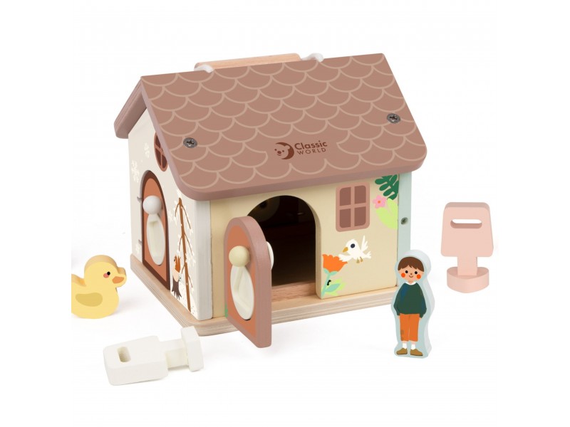 Šis medinis edukacinis namelis su spynelėmis – tai išskirtinis sensorinis žaislas, kuris paskatins jūsų mažylį leistis į jaudinančią atradimų kelionę! Žavus „Classic World“ namelis yra aprūpintas keturiomis skirtingomis durelėmis, o už kiekvienų iš jų slepiasi unikalus užrakto mechanizmas. Žaidimo tikslas – pritaikyti tinkamos formos raktelį prie atitinkamų durelių spynelės. Atrakinus dureles, viduje laukia spalvingos kaladėlės su linksmais paveikslėliais, vaizduojančiais meškiuką, dovanėlę ir kitus personažus. Durelių atidarymas ir uždarymas yra puiki treniruotė lavinanti smulkiąją motoriką, vikrumą ir loginį mąstymą. Žaislas pagamintas iš tvirtos ir saugios medienos, sukurtas skatinti vaikų smalsumą ir vaizduotę jau nuo 18 mėnesių amžiaus.