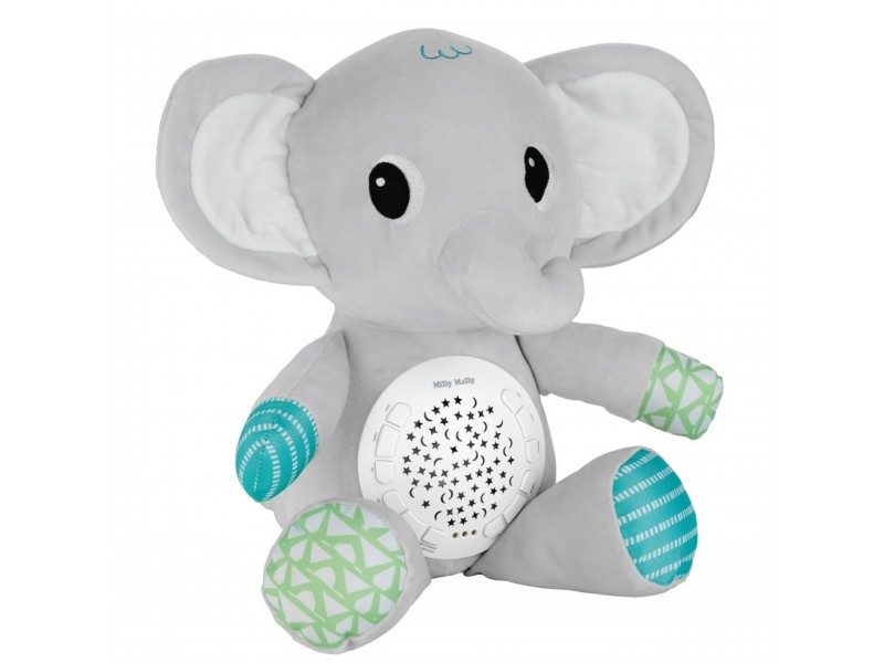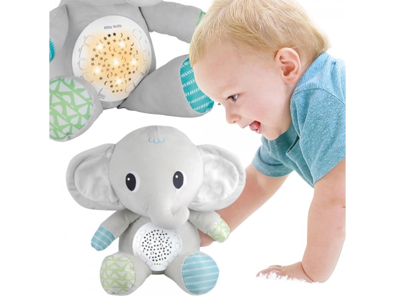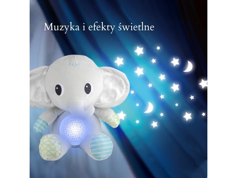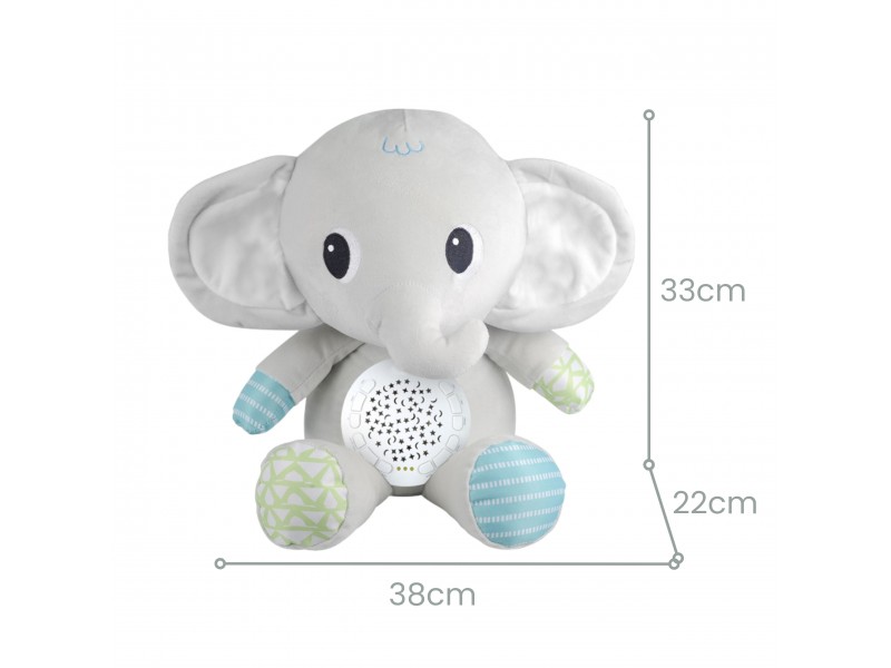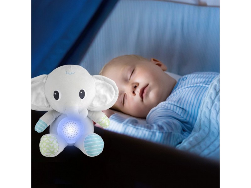 Minkštas drambliukas su projektoriumi iš „Woopie“ yra idealus draugas kiekvienam naujagimiui ir kūdikiui. Šis žavus pliušinis žaislas sujungia žvaigždžių bei mėnulio projektoriaus ir muzikinės dėžutės su raminančiomis melodijomis funkcijas. Drambliukas padės nuraminti mažylį prieš miegą ir sukurti kambaryje stebuklingą, atpalaiduojančią atmosferą. Garso ir šviesos modulis, įmontuotas drambliuko pilve, siūlo net 12 melodijų, įskaitant švelnias lopšines ir raminantį baltąjį triukšmą. Taip pat turi laikmačio funkciją, leidžiančią automatiškai išsijungti po 30, 60 arba 90 minučių. Žaislas pagamintas iš minkšto, saugaus pliušo, puikiai tinka priglausti ir yra saugus naudoti nuo pat gimimo.