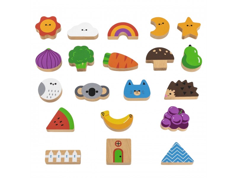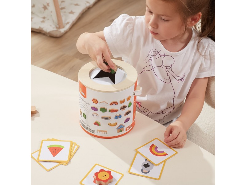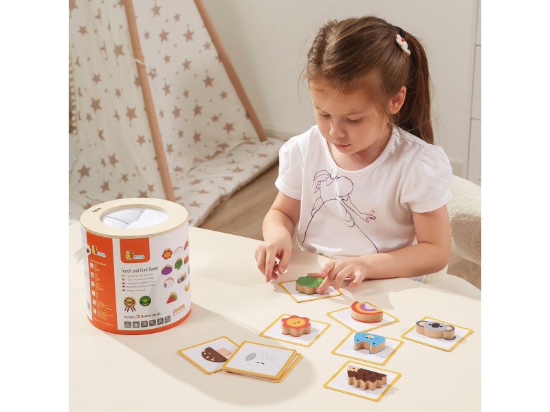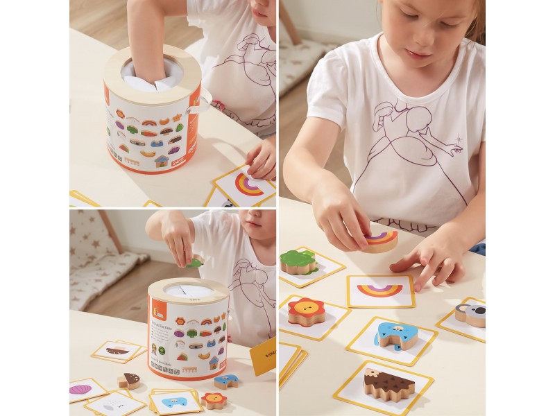 - Medinių kaladėlių ir žaidimo kortelių rinkinys „Atspėk lytėdamas“.