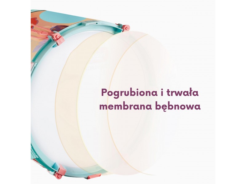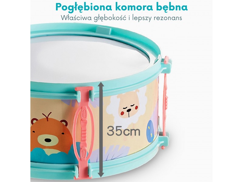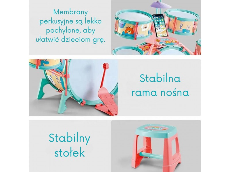 Šis vaikiškas būgnų rinkinys pagamintas iš lengvo plastiko, todėl net ir nuvirtęs nesukels jokių sužalojimų, o prireikus jį lengva valyti tiesiog nuvalant drėgna šluoste. Ryškios spalvos, saugios medžiagos ir pasakiška grafika su gyvūnėlių motyvais lemia, kad vaikai pamils grojimą nuo pat pirmo būgnelio dūžio. Tai idealus žaislas jūsų vaiko muzikinio nuotykio pradžiai!