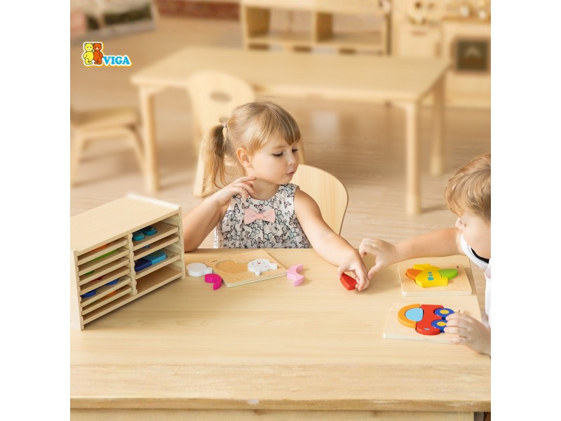 Leiskite vaikui žengti į kūrybingo žaidimo pasaulį su Viga medinėmis dėlionėmis. 12 spalvingų lentelių su paprastomis formomis ir mielais paveikslėliais skatina vaikus dėlioti bei eksperimentuoti. Vaiko užduotis – priderinti elementus į jiems skirtas vietas, o tai puikiai lavina rankų įgūdžius ir loginį mąstymą. Saugus, lakuotas medis ir ryškios spalvos užtikrina, kad žaidimas būtų ne tik malonus, bet ir visiškai saugus. Tai idealus būdas mokytis žaidžiant ir puikus pirmasis pažinimas su dėlionėmis.