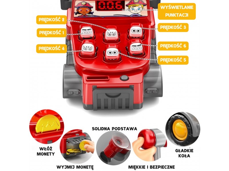 „Woopie“ prekės ženklo gaisrinė mašina „2in1“ yra išskirtinis žaislas, kuris suteiks vaikams valandų valandas kūrybingos, aktyvios ir emocingos veiklos. Tai dinamiško arkadinio žaidimo „Mušk kurmį“ ir klasikinės važiuojančios mašinėlės derinys. Tiesiog įmeskite monetą, griebkite minkštą plaktuką ir rinkite taškus, pataikydami į „kurmius“, kurie čia pavaizduoti kaip maži raudoni automobiliai! Spalvingas dizainas, tvirta konstrukcija ir daugiafunkciškumas užtikrina, kad šis žaislas patrauks kiekvieno mažojo ugniagesio dėmesį.