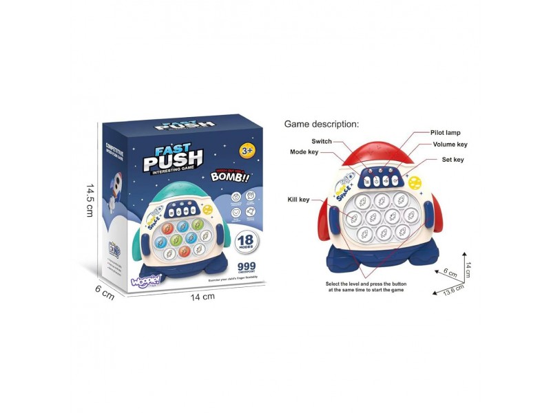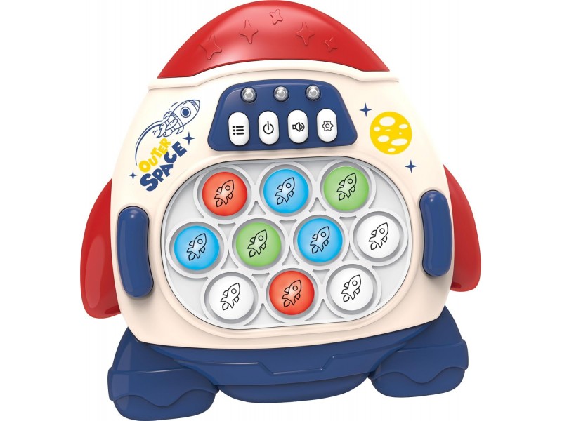 Elektroninis žaidimas „Pop It“ Raketa – tai puikus antistresinis žaislas, tinkantis tiek mažiausiems, tiek suaugusiems. Interaktyvus žaislas skleidžia linksmus garsus, kurie paįvairina pramogą ir skatina vaikus aktyviai žaisti. Dėl kompaktiško dydžio, šį žaidimą itin patogu pasiimti su savimi į keliones. Tai ne tik smagi pramoga, bet ir puiki lavinamoji priemonė, padedanti mankštinti protą, rankų miklumą, akių ir rankų koordinaciją bei pastabumą, taip pat veiksmingai mažinanti stresą.