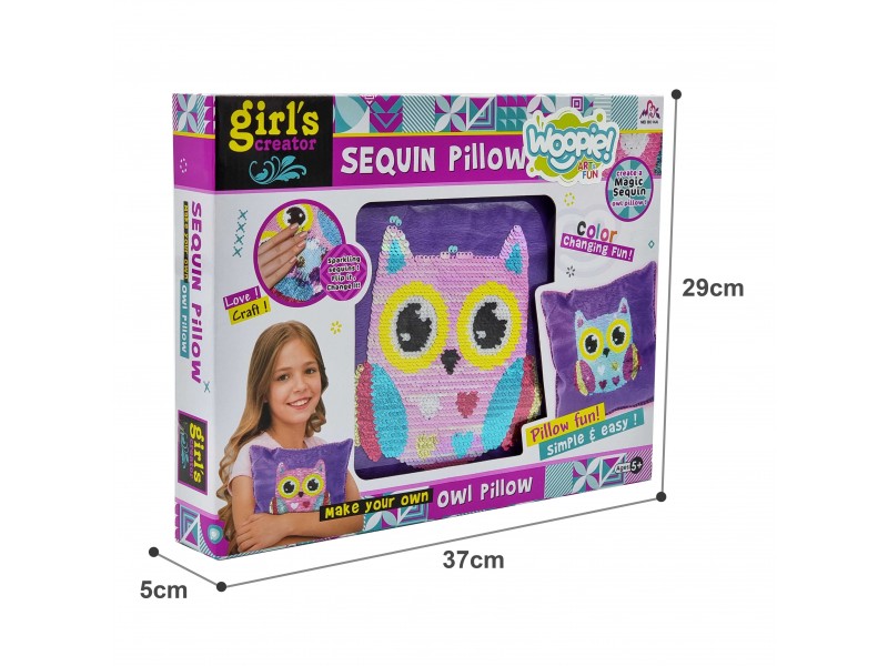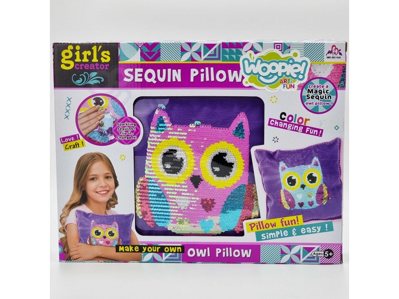 WOOPIE prekės ženklo „Art&Fun“ serijos pagalvėlė su blizgučiais „Pelėda“ supažindins jūsų vaiką su mados ir dizaino pasauliu! Tai puikus kūrybinis rinkinys kiekvienam vaikui. Rinkinyje rasite viską, ko reikia: užvalkalą, pagalvėlę, blizgučius, adatą ir siūlą. Pats pagalvėlės siuvimas ir dekoravimas yra paprastas, tad kiekvienas vaikas su tuo lengvai susidoros – tereikia šiek tiek vaizduotės ir kūrybiškumo! Pagaminta pagalvėlė pasižymi įdomia savybe: ją patrynus, ji keičia spalvą dėl dvipusių blizgučių. Šis rinkinys ne tik smagi pramoga, bet ir priemonė, ugdanti pirmuosius pomėgius siuvimui bei madai, skatinanti kantrybę, o svarbiausia – lavinanti rankų įgūdžius ir smulkiąją motoriką.
