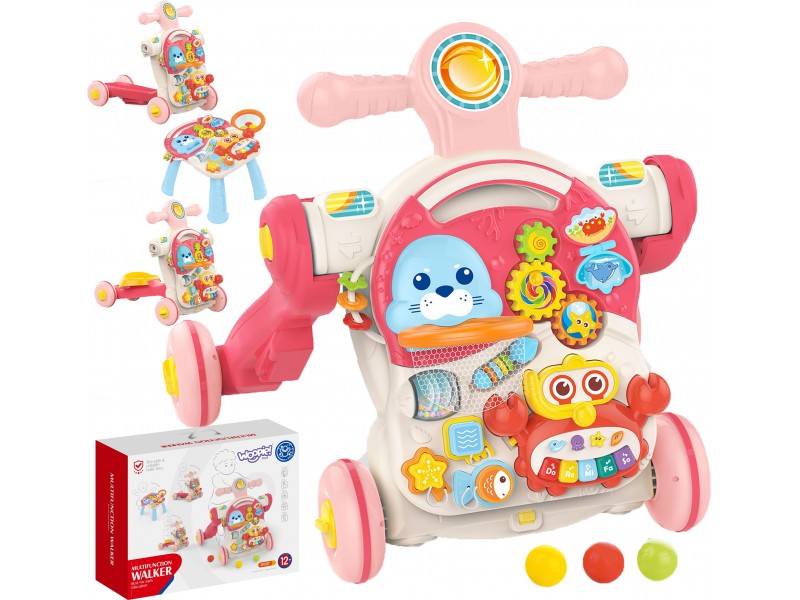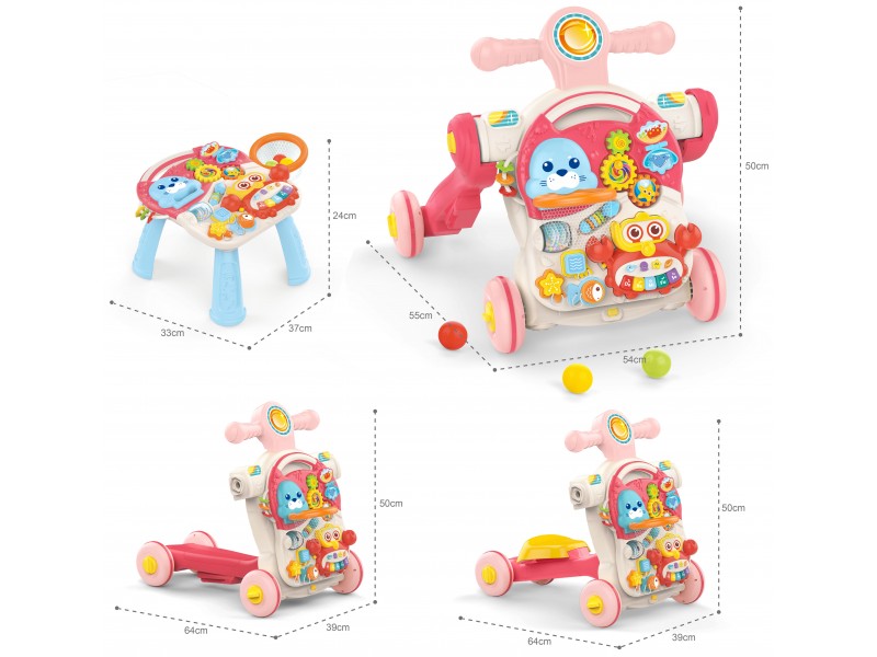 - Lavinamasis žaislas 4 viename: stumdukas, paspirtukas, paspiriama mašinėlė ir edukacinis staliukas.