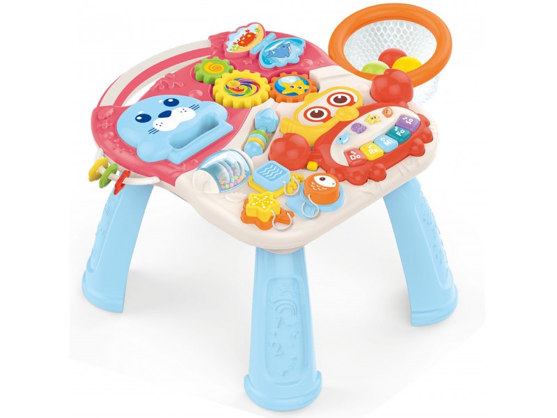 Pagrindinis skydelis siūlo daugybę pramogų: krabą-mini pianiną muzikiniam lavinimui, judančias dureles su linksmais gyvūnais, besisukančius krumpliaračius, spalvingas kaladėles ant virvelių formų ir spalvų mokymuisi, besisukantį barškutį, mini skaičiuotuvą su žiedeliais ir daugelį kitų interaktyvių elementų. Saugumas yra pirmoje vietoje – žaislas pagamintas iš aukščiausios kokybės, sertifikuotų ir estetiškų medžiagų. Jis neturi jokių nelygumų ar aštrių briaunų, todėl garantuojamas visiškas naudojimo saugumas.