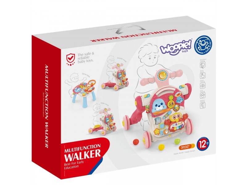 Atraskite begalines žaidimo galimybes su Woopie daugiafunkciniu interaktyviu žaislu 4 viename. Šis lavinamasis stumdukas taps mėgstamiausiu jūsų mažylio palydovu, lydinčiu jį kiekviename žingsnyje – nuo pirmųjų ropojimų dienų iki laisvo judėjimo. Žaislas yra tikras staigmenų lobynas, kurį vaikas gali savarankiškai tyrinėti. Tai įmanoma sujungus kelias funkcijas viename gaminyje: stumduko, paspirtuko, paspiriamos mašinėlės ir edukacinio staliuko. Dėl šios įvairovės žaislas ilgai nepabos.