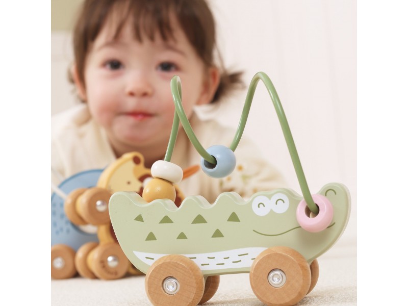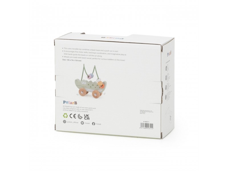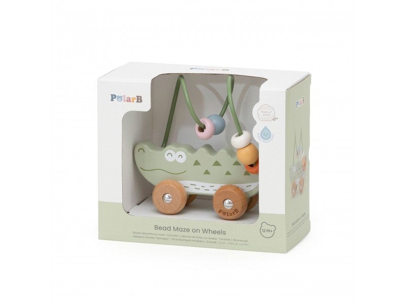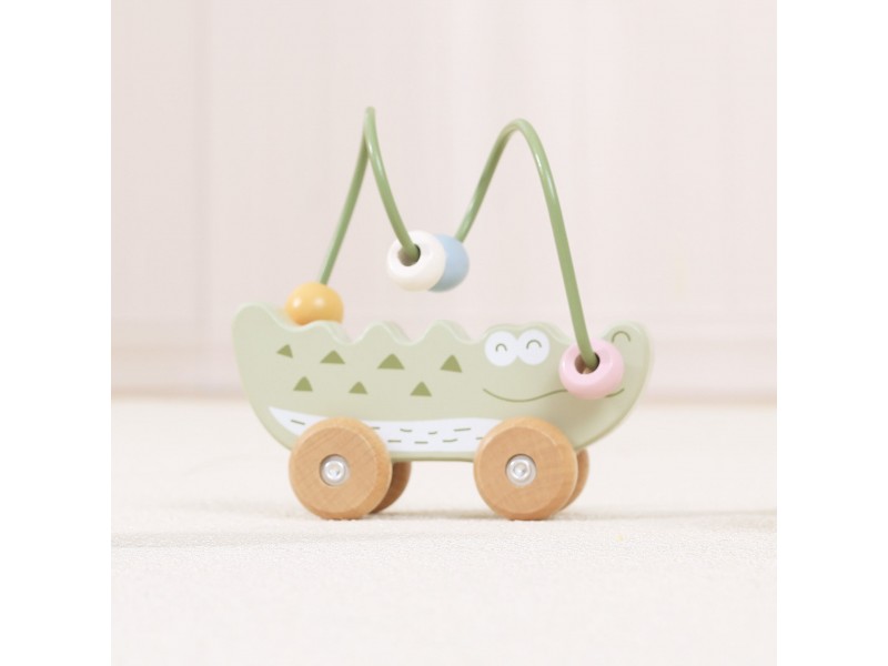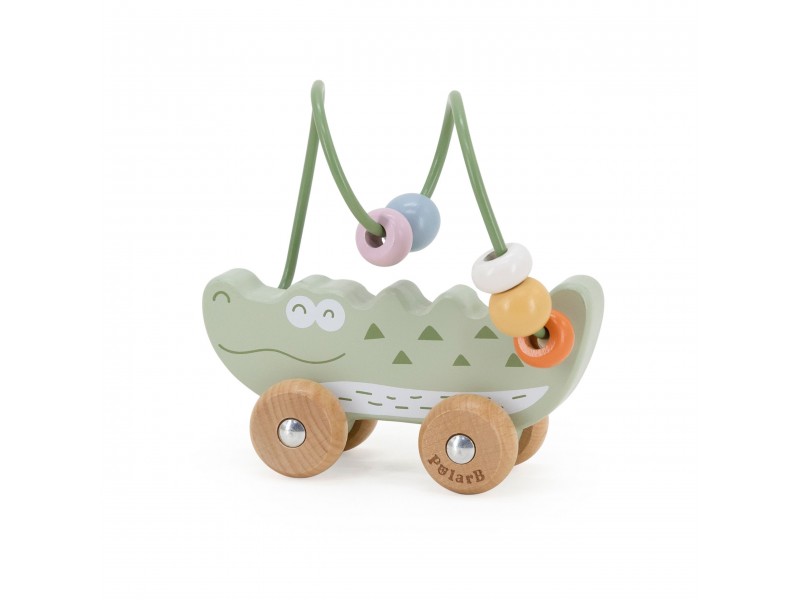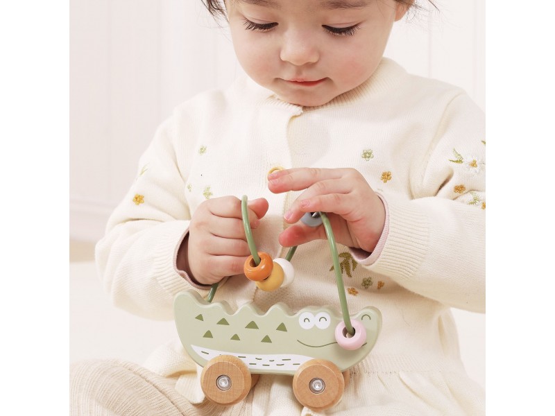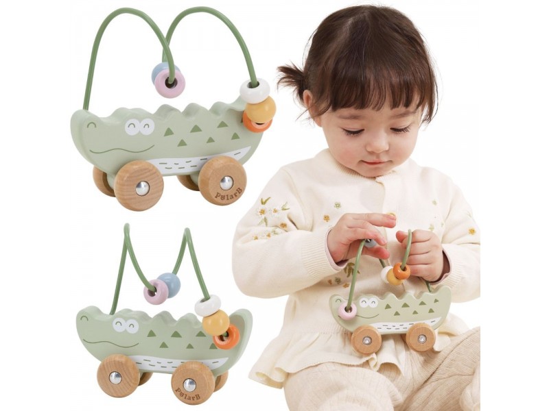 Žavus krokodilo formos karoliukų labirintas – tai idealus pirmasis lavinamasis žaislas mažyliui nuo 12 mėnesių amžiaus. Jis sujungia karoliukų labirinto ir stumiamo žaislo funkcijas, suteikdamas dvigubą džiaugsmą žaidžiant. Vaikas gali stumdyti spalvotus karoliukus metaliniu lanku arba ridenti žaislą grindimis, taip lavindamas savo motorinius įgūdžius. Natūrali buko mediena ir užapvalinti kraštai garantuoja saugumą žaidimo metu. Tai puikus pasirinkimas tėvams, ieškantiems patvaraus, estetiško ir edukacinio žaislo.