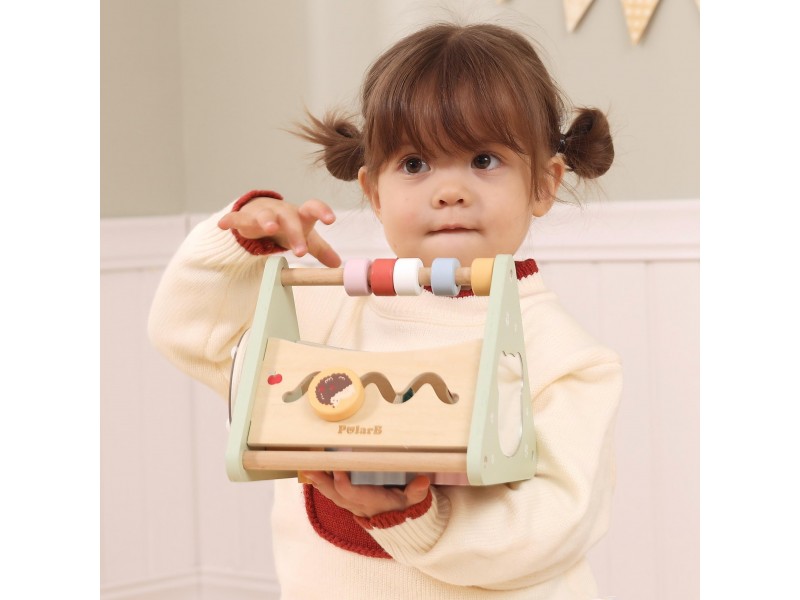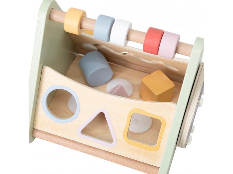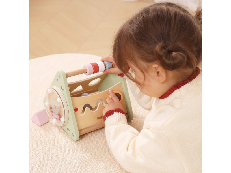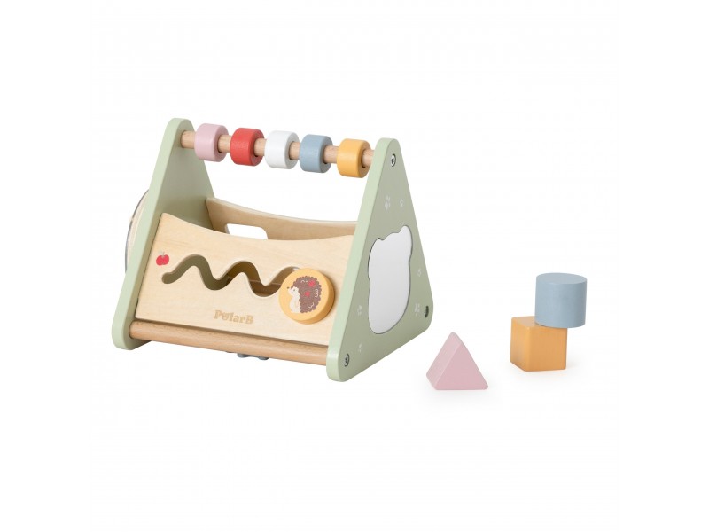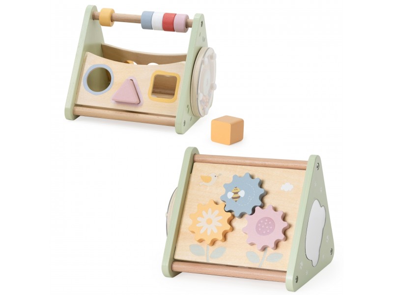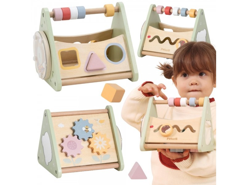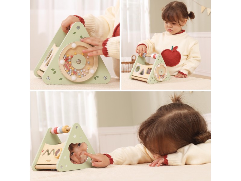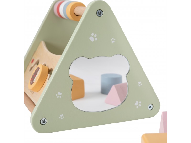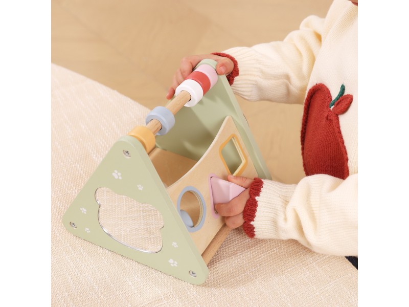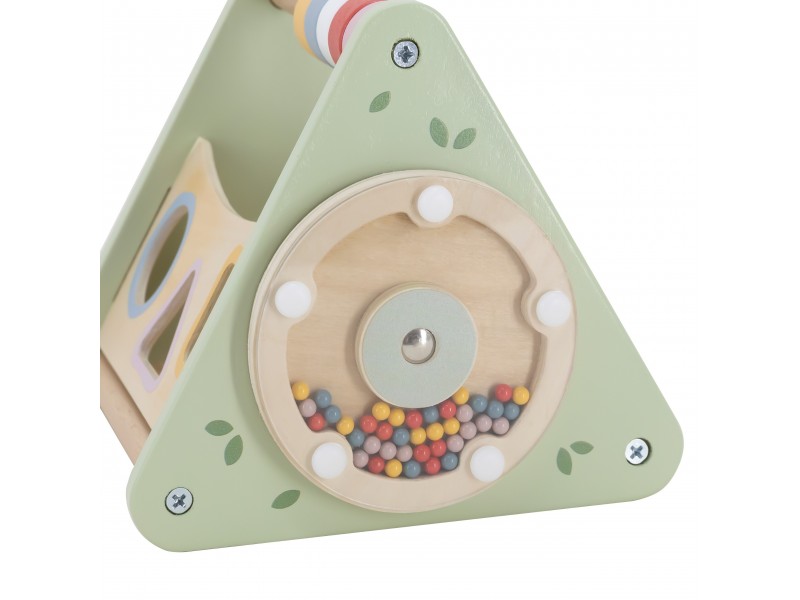Veiklos trikampis – tai universalus medinis lavinamasis žaislas iš „Viga“ prekės ženklo, užtikrinantis vaikui ilgas kūrybiško ir edukacinio žaidimo valandas. Dėl penkių stabilių kraštinių ir šešių skirtingų veiklų, mažylis gali atrasti formų, spalvų ir garsų pasaulį iš kiekvienos pusės. Žaislas sukurtas taip, kad skatintų smulkiosios motorikos bei rankų ir akių koordinacijos vystymąsi. Tvirta konstrukcija leidžia saugiai žaisti ant bet kokio lygaus paviršiaus. Papildomas privalumas – patogi rankena, atliekanti skaitliukų funkciją, kuri palengvina žaislo nešiojimą.