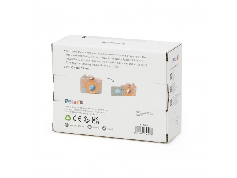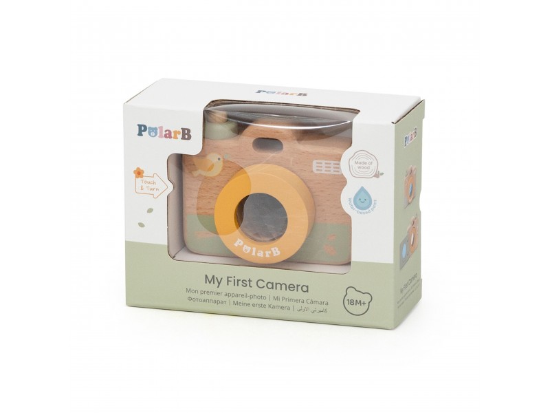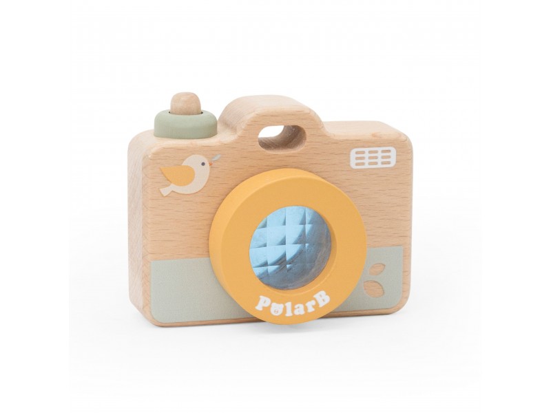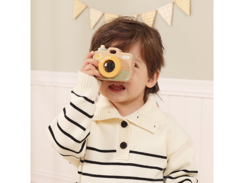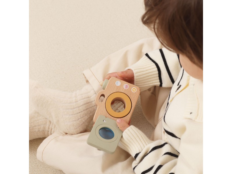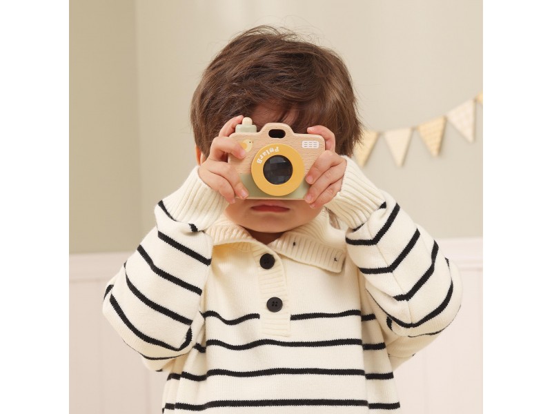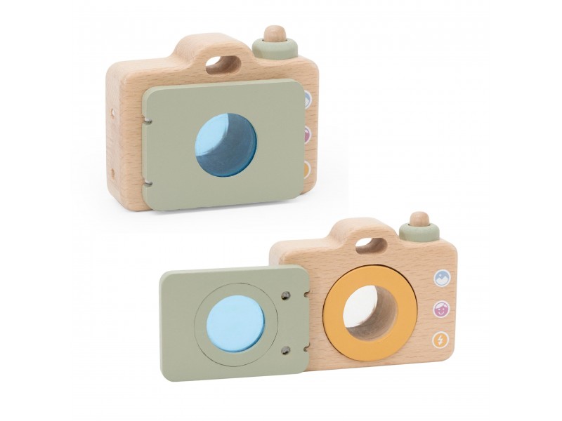Medinis fotoaparatas „Mano pirmasis fotoaparatas“ iš prekės ženklo „Viga“ yra unikalus lavinamasis žaislas, skirtas vaikams nuo 18 mėnesių. Dėl besisukančio kaleidoskopo objektyvo vaikas atranda spalvas ir formas, lavindamas vaizduotę bei pojūčius. Natūrali buko mediena, pastelinės spalvos ir saugūs, užapvalinti kraštai garantuoja žaidimo patogumą bei saugumą. Atlenkiamas galinis skydelis suteikia papildomos interakcijos ir paįvairina pramogą. Tai ideali idėja pirmajam vaiko fotoaparatui ir puiki dovana, skatinanti žaisti be jokių išmaniųjų ekranų.