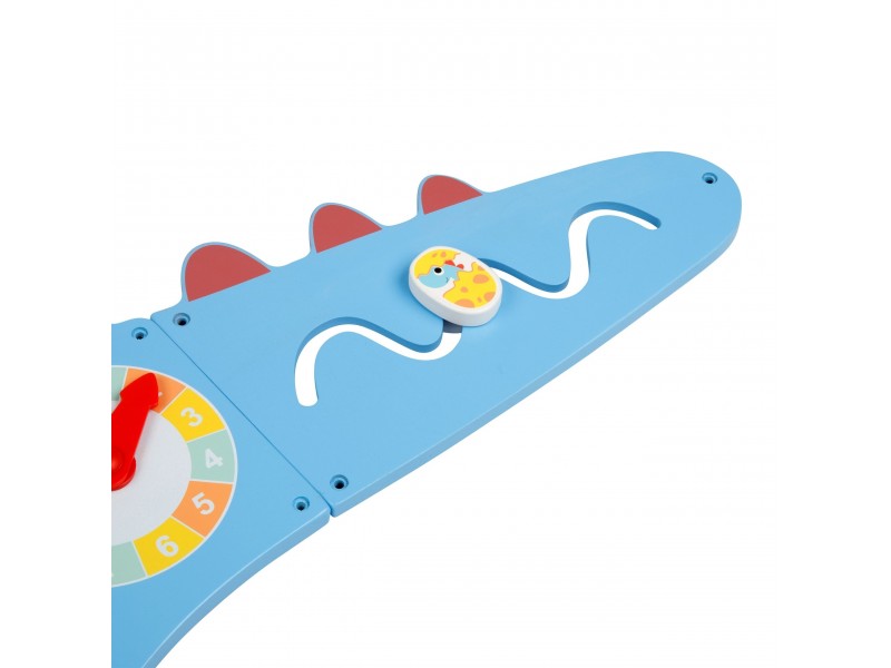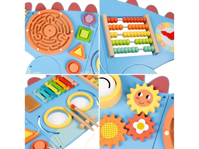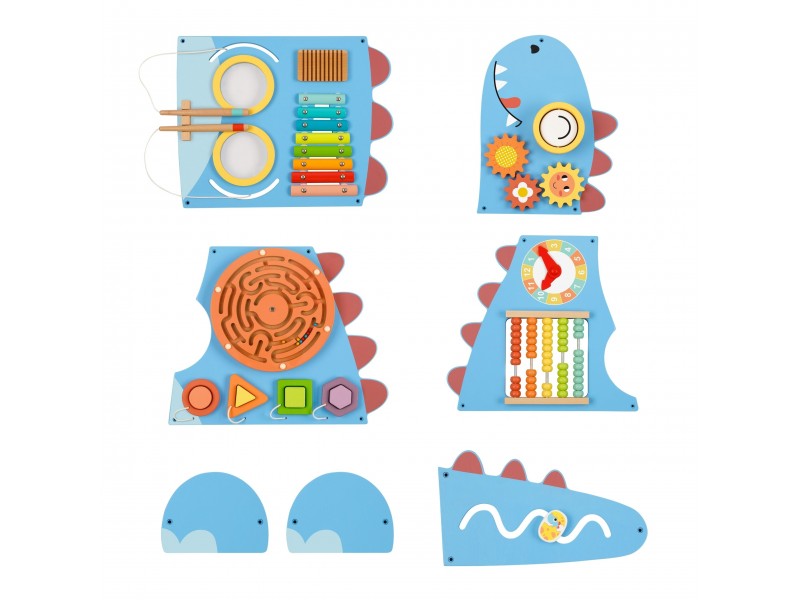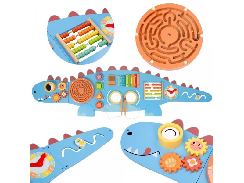 Atraskite magišką dinozaurų pasaulį, sujungtą su lavinamuoju nuotykiu! Ši unikali, mielo dinozauro formos medinė veiklos lenta yra tikras pramogų centras mažiesiems atradėjams. Penkios skirtingos dalys siūlo gausybę veiklų, kurios ilgam prikaustys vaiko dėmesį ir kartu lavins svarbiausius įgūdžius. Kiekvienas lentos elementas yra apgalvotai sukurtas, siekiant skatinti pažintinį smalsumą ir suteikti atradimo džiaugsmą.