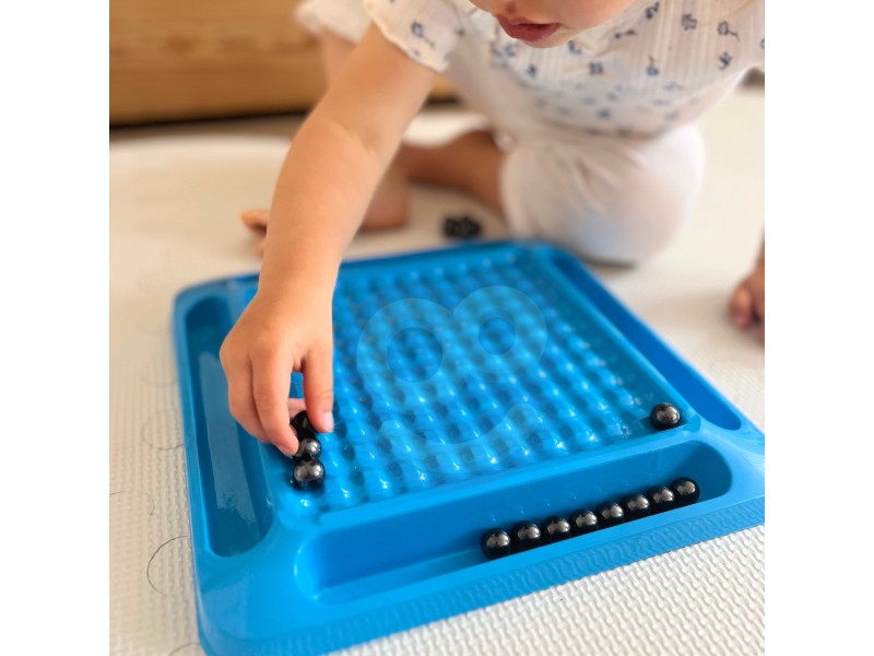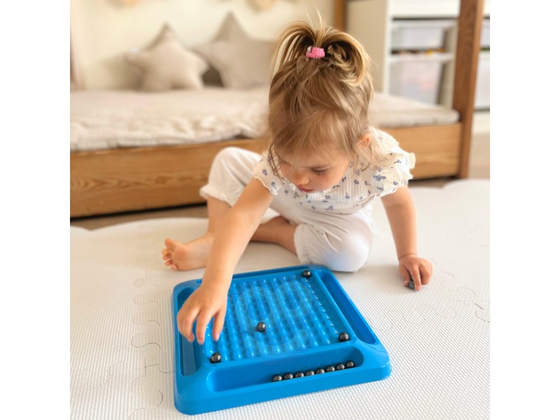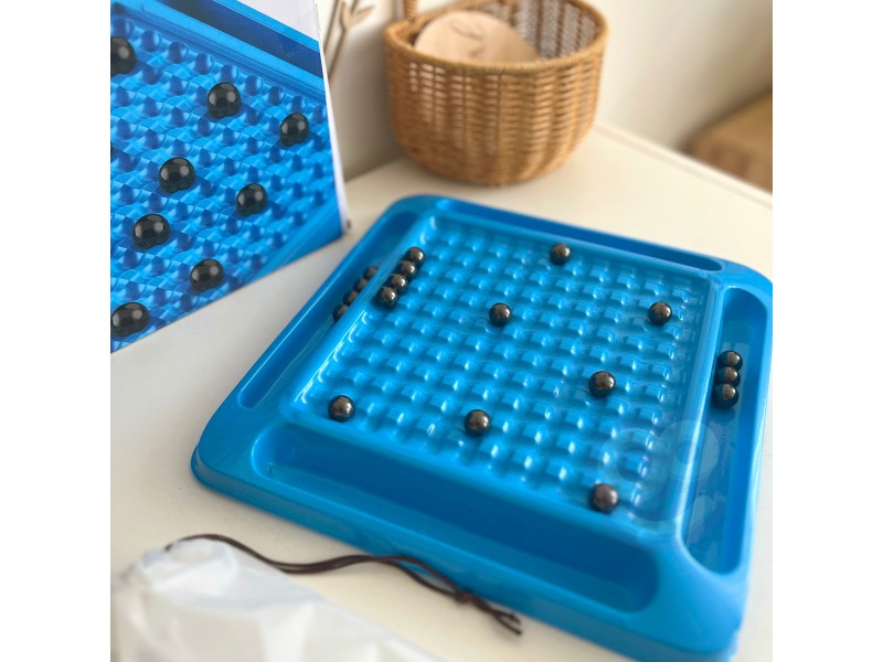 - Rinkinį sudaro: 20 magnetinių rutuliukų, žaidimo lenta su 4 loveliais magnetams, maišelis rutuliukams.