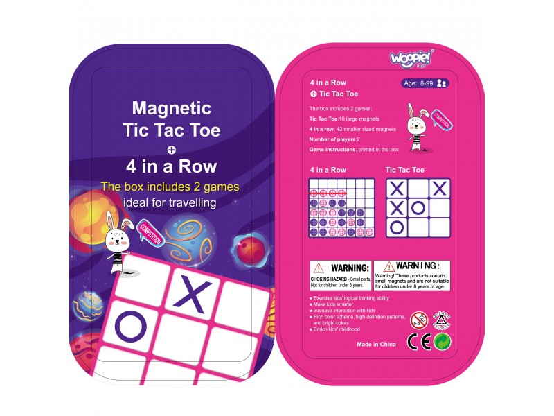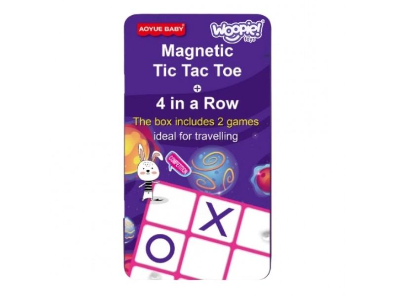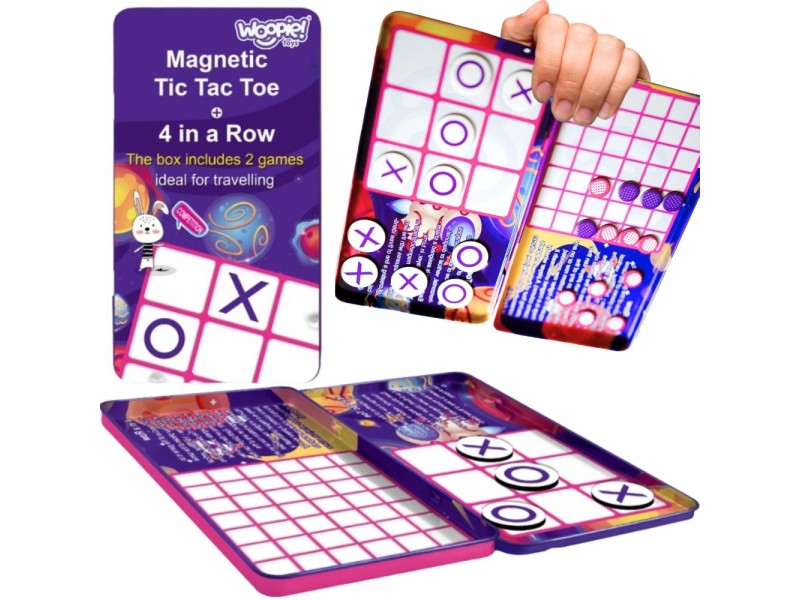 Prekės ženklo Woopie žaidimas „Kryžiukai-nuliukai“ ir „Keturi eilėje“ – tai įdomus pasiūlymas daug keliaujantiems žmonėms. Ši mini formato magnetinių žaidimų serija tilps į bet kurią rankinę ar kuprinę. Žaidimas sveria labai mažai, todėl jį visada galite turėti po ranka. Jis puikiai pasiteisins laukiant vizito pas gydytoją, ilgesnėje kelionėje automobiliu ar lėktuvu. Metalinė dėžutė tarnauja kaip žaidimo lenta, todėl žaidimo gabaritai yra minimalūs, o detalės nepasimeta.