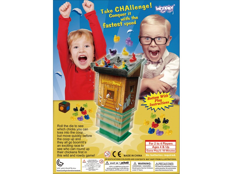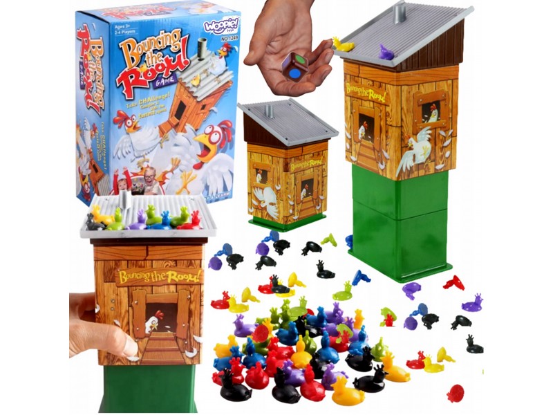 Prekės ženklo WOOPIE miklumo žaidimas „Sprogstanti vištidė“ yra jaudinantis stalo žaidimas, kurio metu žaidėjai atsitiktine tvarka dėlioja spalvotus viščiukus ant vištidės stogo, spalvas pasirinkdami pagal kauliuką. Vištidė gali netikėtai sprogti, o žaidėjas, kuris tuo metu laiko kauliuką, turi surinkti viščiukus.