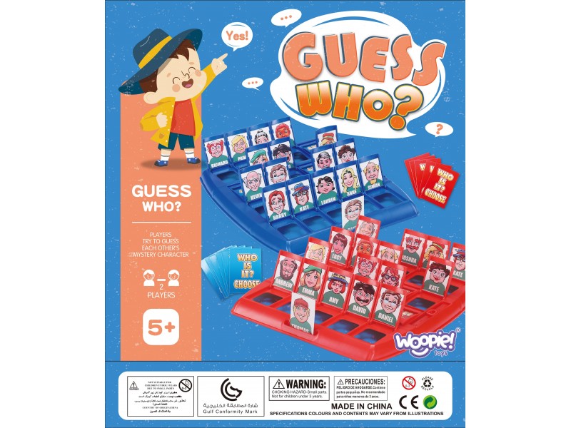 Prekės ženklo Woopie šeimos žaidimas "Atspėk kas?" yra puikus kortų ir logikos žaidimas, skatinantis šeimos tarpusavio bendravimą. Šis žaidimas leidžia lavinti vaizduotę ir kūrybiškumą. Dėl nedidelio, kompaktiško dydžio jį patogu pasiimti su savimi į kelionę. Rinkinyje yra dvi žaidimo lentos: raudona ir mėlyna.