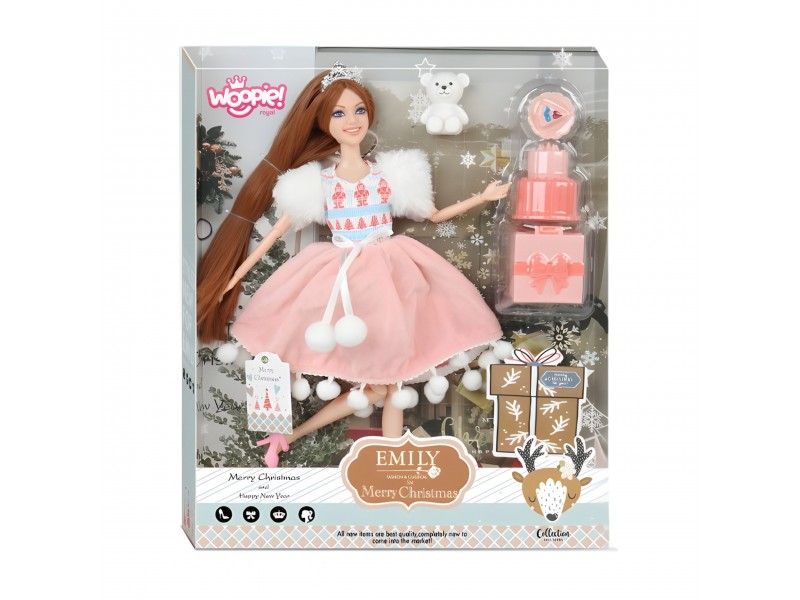 Woopie prekės ženklo lėlė Emi su meškiuku ir žiemine suknele yra išskirtinis žaislas, kuris nukels kiekvieną vaiką į magišką mados ir svajonių pasaulį. Graži lėlė ilgais rudais plaukais ir karūna ant galvos, pasipuošusi žiemine suknele su burbulais ir kailinėmis rankovėmis, sužavės kiekvieną mažąją stiliaus mylėtoją. Rinkinyje taip pat yra mielas meškiukas – ištikimas žaidimų draugas, bei aksesuarai: dovana, tortas ir lėkštutė su torto gabalėliu. Apranga ir aksesuarai yra rožinės ir baltos spalvų gamos.