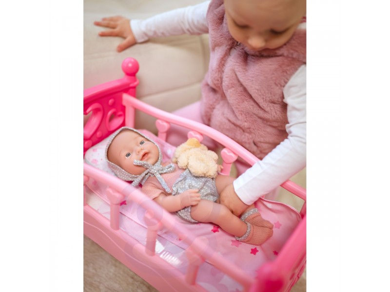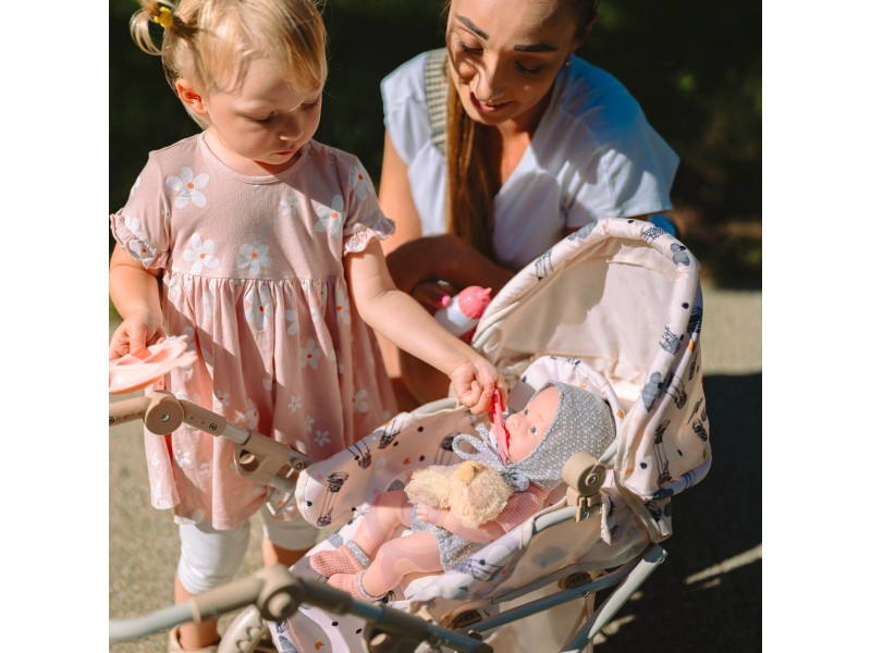 „Mano mylima lėlė“ iš WOOPIE ROYAL serijos yra aukščiausios kokybės, kruopščiai pagamintas produktas, kurį tikrai pamils jūsų vaikas. Lėlytė aprengta dailiu drabužėlių komplektu, priderintomis kojinėmis bei kepurėle. Papildomai rinkinyje yra žavus meškiukas, kurį lėlė gali laikyti pakaitomis su buteliuku. Kūdikis turi judančias galūnes, o į burnytę galima įdėti rinkinyje esantį čiulptuką. Tai puikus žaislas, skatinantis vaizduotę ir rūpestingumą.