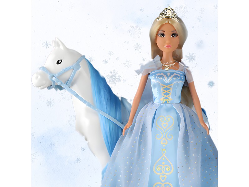 - Lėlė princesė papuošta žydra, baline suknele ir diadema.