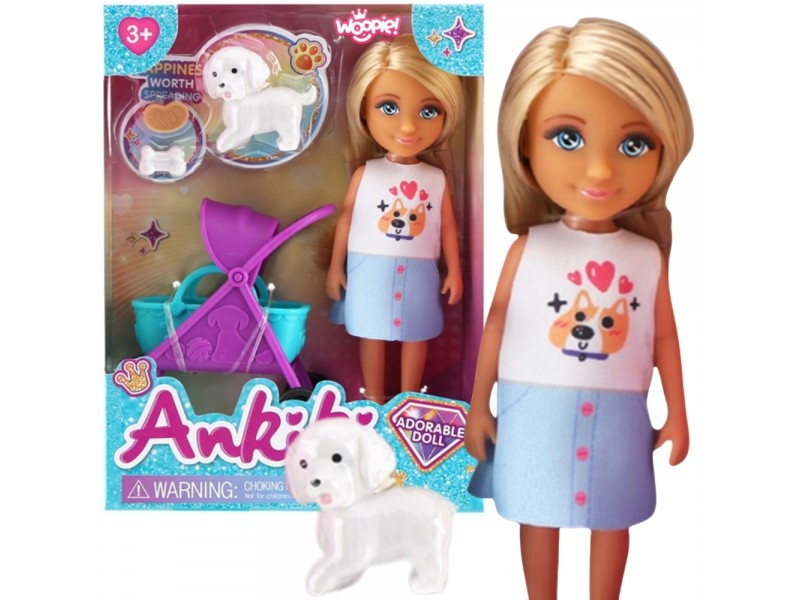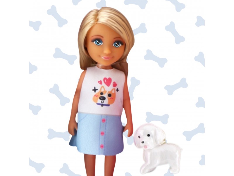 - Graži lėlė šviesiais plaukais, mėlynomis akimis, aprengta balta palaidine su mielu šuniuko atvaizdu ir žydru sijonėliu.