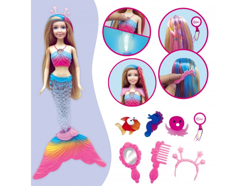 - Lėlė undinėlė su ilgais šviesiais plaukais, skirtais šukuosenų formavimui.