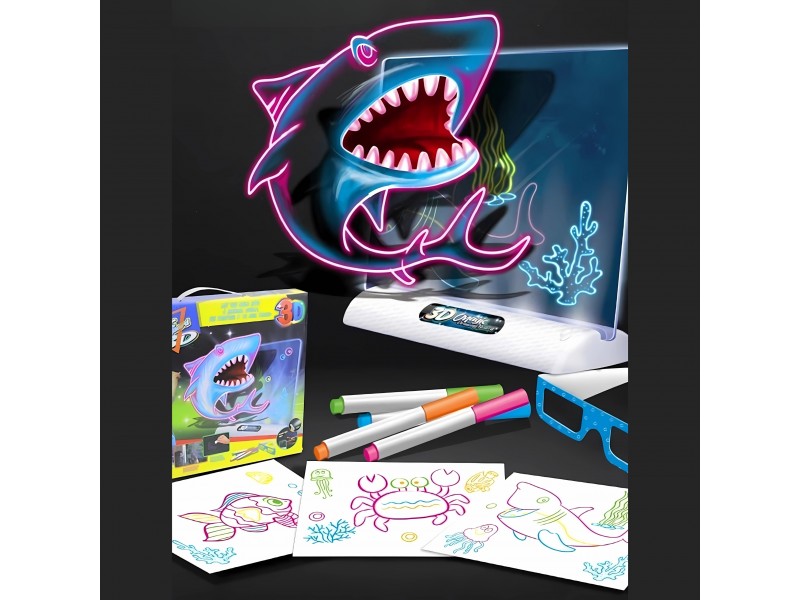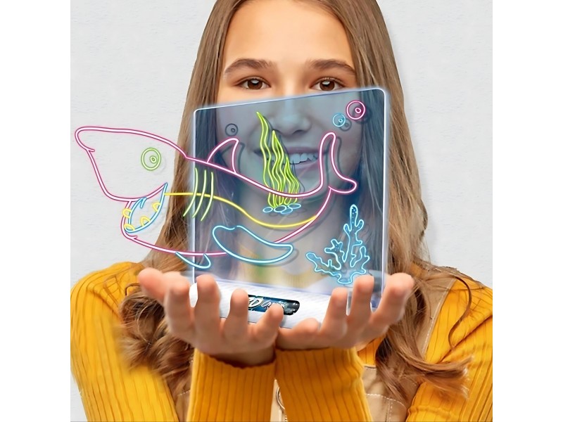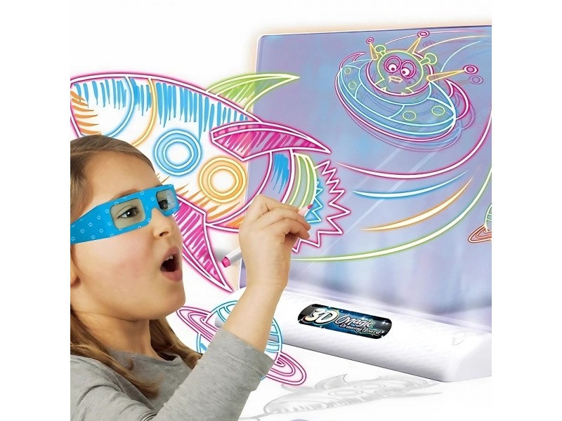 - Nupiešus paveikslėlį, įjungus LED apšvietimą ir užsidėjus pridedamus akinius, piešinys įgauna įspūdingą trimatį (3D) efektą.