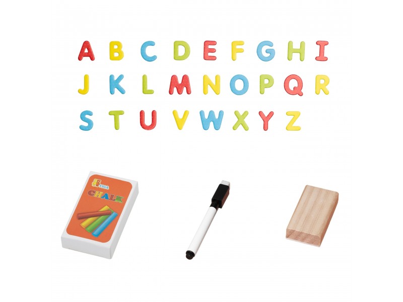 - 26 magnetinių raidžių rinkinys (abėcėlė, tvirtinama ant baltosios pusės).