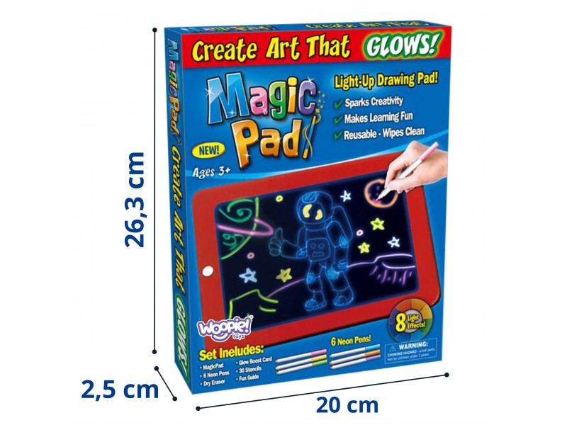 Atraskite kūrybos džiaugsmą su magiška WOOPIE piešimo planšete! Tai ne paprasta piešimo lenta – tai šviečiantis stebuklas, kuris jūsų vaiko piešinius pavers ryškiais, neoninėmis spalvomis spindinčiais meno kūriniais. Įjungus LED apšvietimą, kiekvienas brūkšnys atgyja ir prikausto dėmesį. Daugkartinio naudojimo paviršius, specialūs neoniniai žymekliai ir pridedami šablonai pavers piešimą, raidžių ir skaičių mokymąsi nepamirštama ir tvarkinga pramoga.