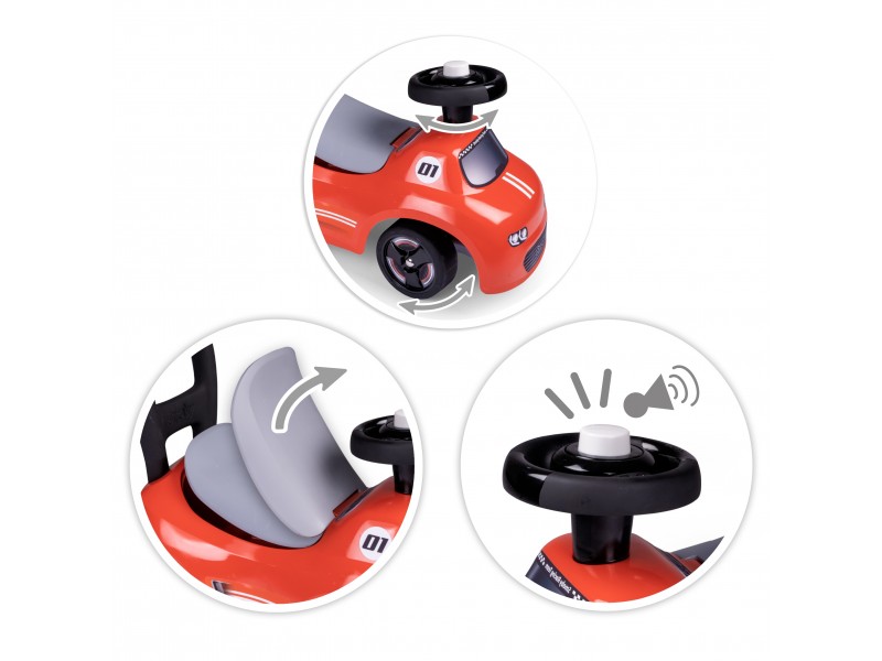 Ergonomiškas atlošas atlieka dvi funkcijas: užtikrina patogią nugaros atramą važiuojant ir tarnauja kaip stumimo rankena, kai vaikas nori stumti mašinėlę. Po sėdyne įrengta slapta daiktadėžė leis mažyliams vežiotis mėgstamiausius žaisliukus ar rastus „lobius“. Vairas su mechaniniu garso signalu suteikia papildomo džiaugsmo ir leidžia pasijusti tikru vairuotoju.