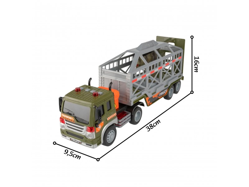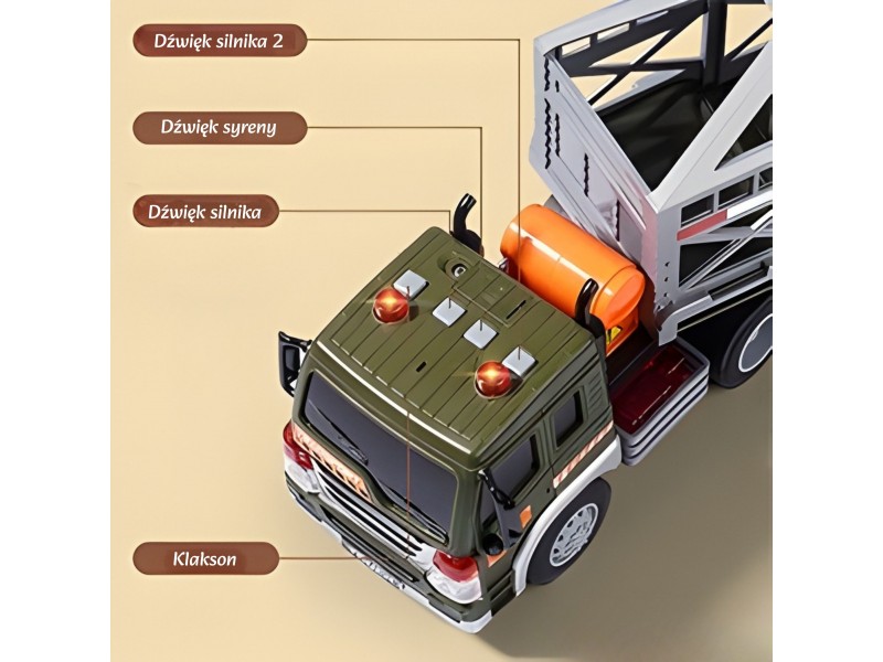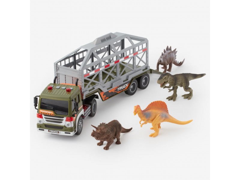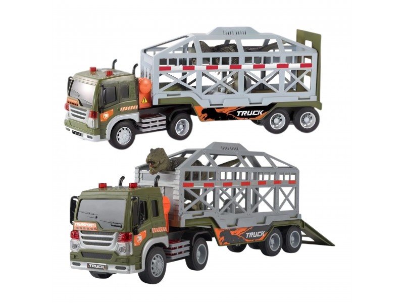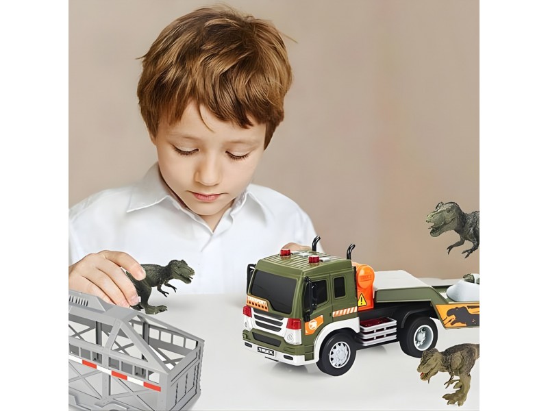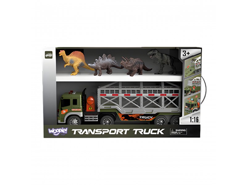 Dinozaurų transporteris iš prekės ženklo WOOPIE yra idealus pasiūlymas kiekvienam mažajam priešistorinių būtybių ir transporto priemonių gerbėjui. Šis įspūdingas rinkinys sujungia didelį sunkvežimį su priekaba bei dinozaurų figūrėles, užtikrindamas daugybę valandų kūrybiško žaidimo. Transporto priemonė turi frikcinę pavarą, todėl pastūmus ji pati važiuoja į priekį. Žaidimo patrauklumą didina garso ir šviesos efektai: ant kabinos stogo yra 4 mygtukai, įjungiantys variklio garsus, garsinį signalą, sireną bei atbulinės eigos garsus, kuriuos lydi mirksinčios šviesos. Priekaba turi atidaromą narvą ir nuleidžiamą rampą, kas leidžia lengvai pakrauti ir iškrauti dinozaurus. Priekabą taip pat galima atkabinti nuo vilkiko, o tai suteikia papildomų žaidimo galimybių.