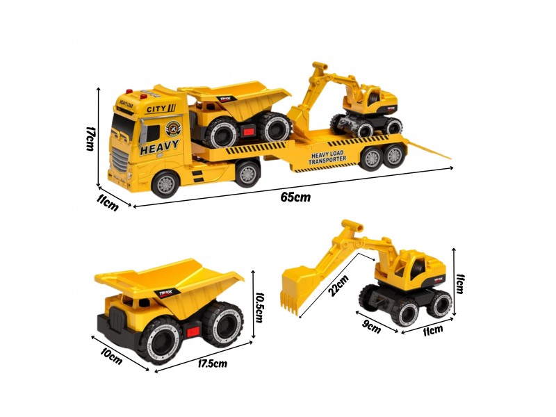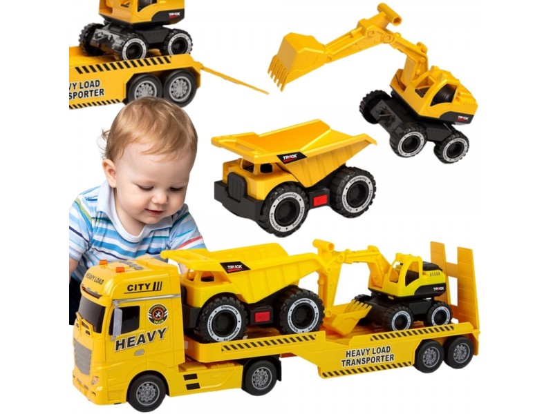 - Rinkinyje yra 3 statybinės transporto priemonės: autovežis, ekskavatorius ir savivartis.