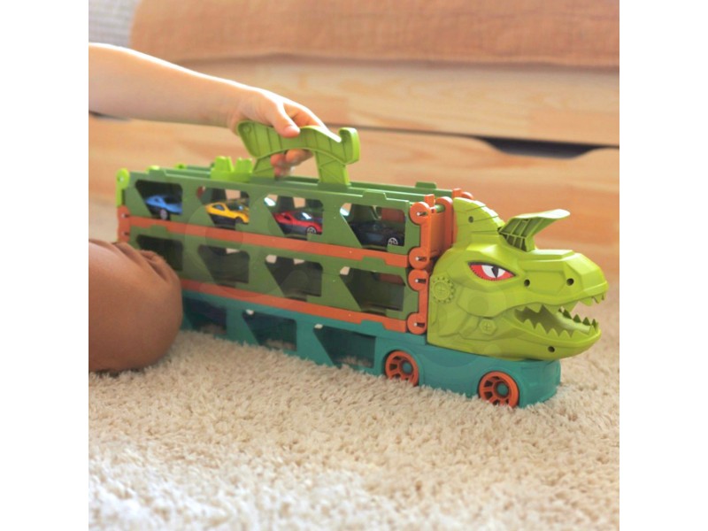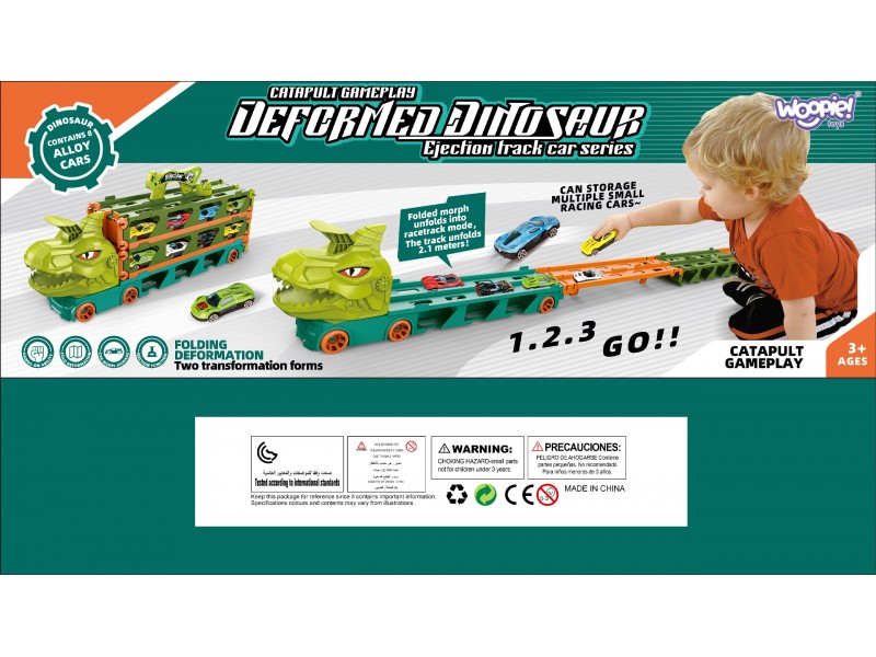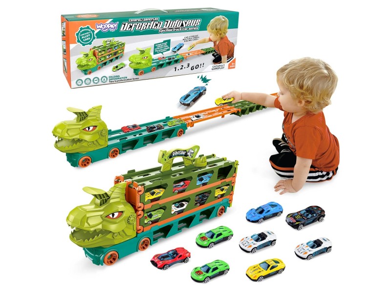 „Woopie“ prekės ženklo žaislinis sunkvežimis „4 viename“ – tai rinkinys, garantuojantis ilgą ir smagią veiklą jūsų vaikui. Didelis T-Rex dinozauras transformuojasi į transportavimo sunkvežimį ir įspūdingą lenktynių trasą. Patikrinkite, kuris automobilis greičiausias! Be to, sulanksčius trasą, vaikas gali žaisti su pačiu sunkvežimiu – žaidimo būdus riboja tik vaizduotė!