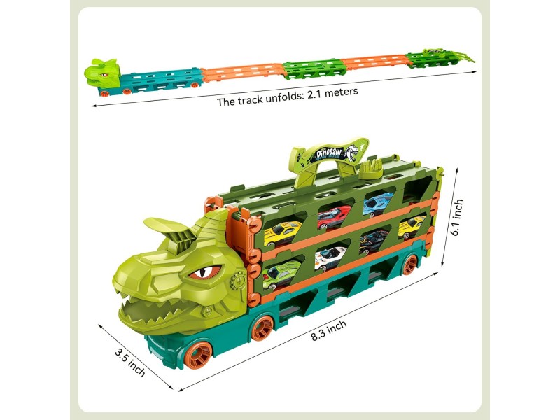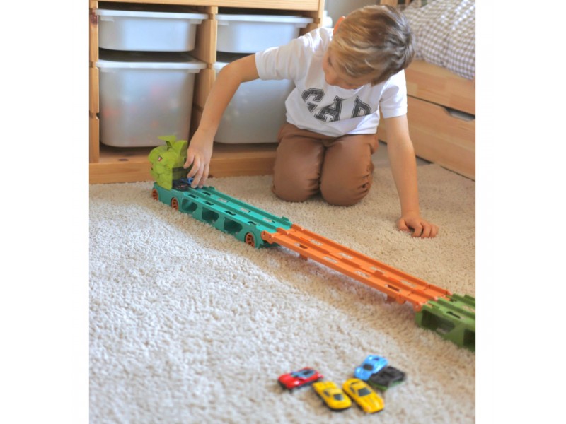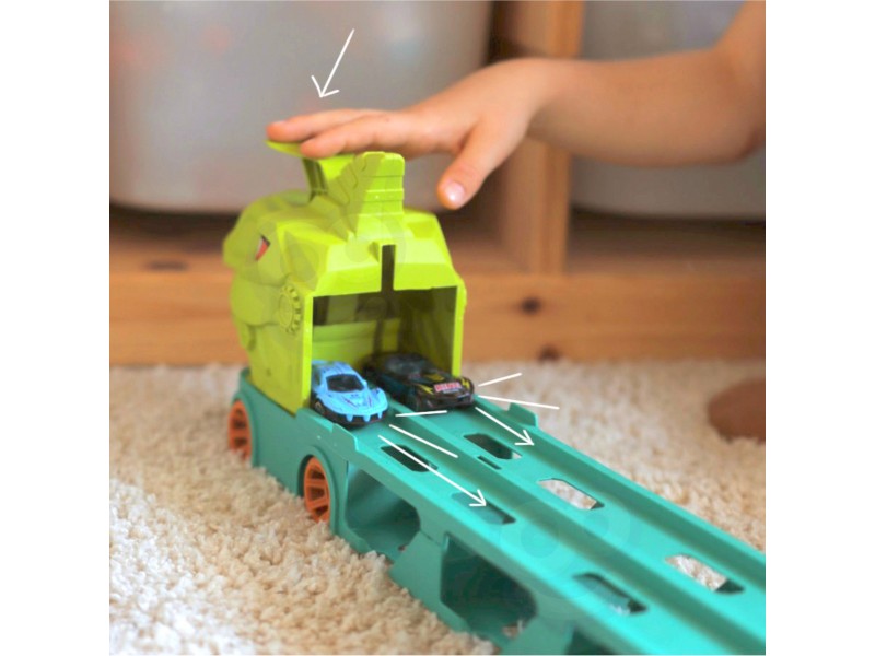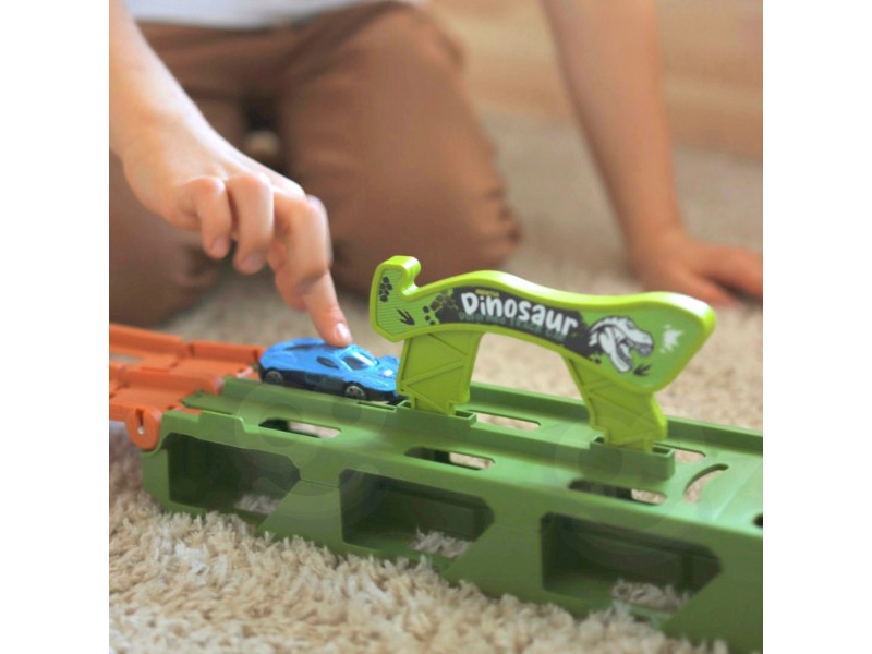 Sulankstytas žaislas užima mažai vietos ir yra patogus automobiliams laikyti – pasibaigus žaidimui, tereikia sulankstyti trasą ir sudėti elementus. Lenktynių metu gali važiuoti du automobiliai, startuojantys nuo T-Rex galvos. Žaislas suteikia papildomų pramogų dėl įmontuoto automobilių paleidimo mechanizmo. Tiesiog paspauskite judantį elementą ant dinozauro galvos, ir automobilis lyg raketa iššaus iš jo nasrų! Trasa sukonstruota taip sumaniai, kad dėžė, skirta laikymui, tuo pačiu yra ir vienas iš trasos elementų.
