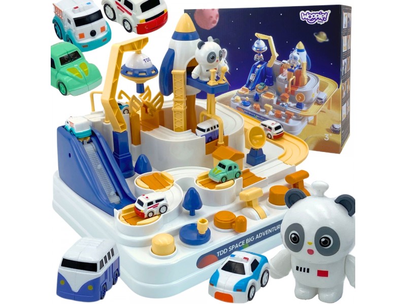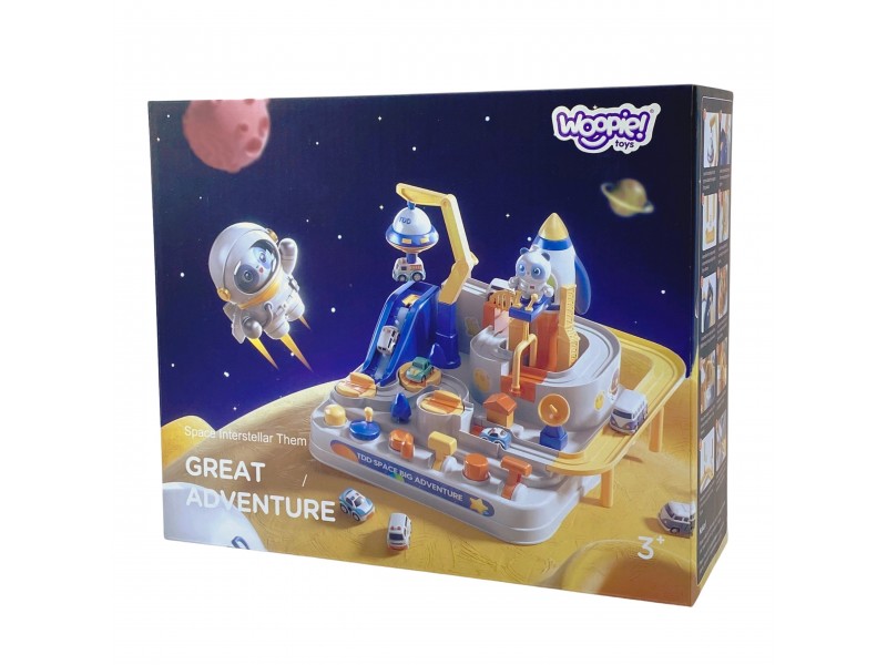 Prekės ženklo Woopie „Kosmoso nuotykis“ yra nepaprasta interaktyvi mašinėlių trasa, kuri nukels jūsų vaiką į jaudinančią kelionę per galaktiką. Šis žaislas veikia kaip vairavimo simuliatorius: vaikas gali valdyti mažą erdvėlaivį ar mašinėlę, važiuojančią judančiu takeliu, ir išvengti kliūčių. Tai puiki pramoga, sujungianti vaizdo žaidimų elementus su fiziniu žaislu, skatinanti vaiko įsitraukimą ir reakciją.