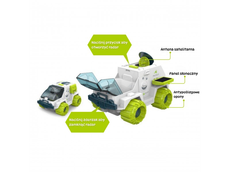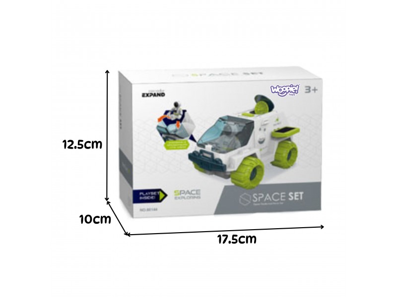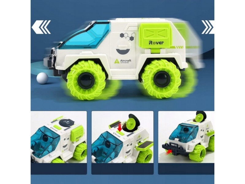 Pasinerkite į jaudinantį kosmoso tyrinėjimų pasaulį su šiuo išskirtiniu „Woopie“ kosminiu visureigiu! Ši naujoviška transporto priemonė su astronauto figūrėle – tai puikus pasirinkimas mažiesiems atradėjams, svajojantiems užkariauti neatrastas planetas. Dėl apgalvotos konstrukcijos ir interaktyvių funkcijų vaikas ne tik patirs daug džiaugsmo žaisdamas, bet ir lavins savo pažintinius gebėjimus, motoriką bei vaizduotę. Kosminis visureigis žavi savo futuristiniu dizainu – baltas kėbulas, ryškiai žalios spalvos ratai ir kitos detalės sukuria įspūdį, lyg tai būtų tikra NASA tyrimų mašina. Dėl atidaromos kabinos mažylis gali lengvai įsodinti astronautą, kuris yra pasiruošęs naujiems iššūkiams. Ant transporto priemonės stogo yra interaktyvus radaras – paspaudus mygtuką, antena automatiškai pakyla, suteikdama žaidimui netikėtumo elementą. O baigus misiją, tereikia paspausti priekinį buferį, ir radaras pats susiskleis – tai lyg tikra kosminė technologija miniatiūrinėje versijoje!