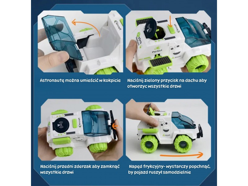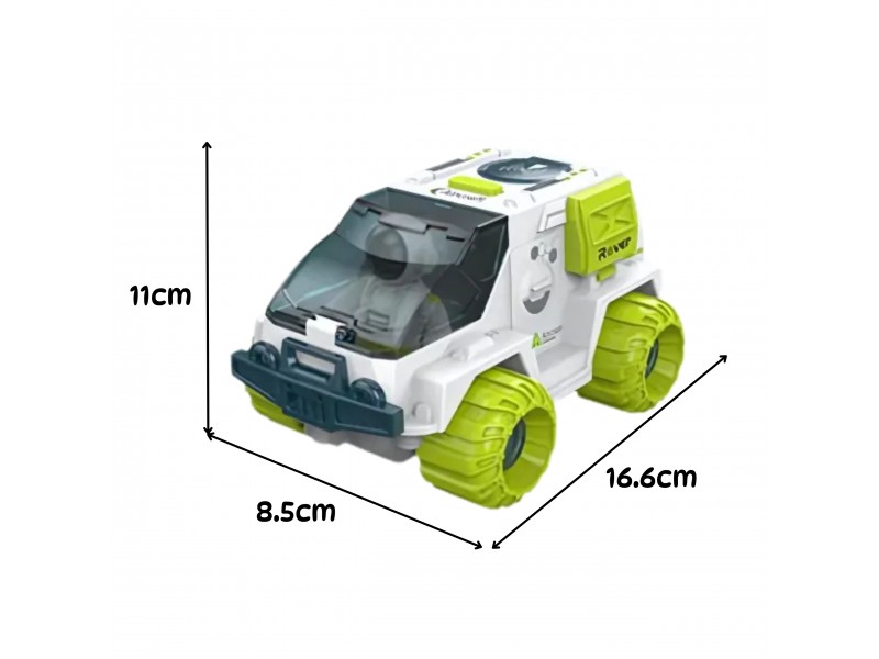 Neslystančios guminės padangos užtikrina stabilų važiavimą ant įvairių paviršių, o frikcinė pavara leidžia visureigiui dinamiškai judėti be jokių baterijų – tiesiog pastumkite jį, ir jis su pagreičiu riedės pirmyn! Tai puikus būdas skatinti vaiko fizinį aktyvumą ir koordinaciją. Šis rinkinys – ideali dovana kiekvienam vaikui, besidominčiam mokslu, kosmosu, technologijomis ir nuotykiais. Tai ne tik žaislas – tai tikro tarpžvaigždinio nuotykio pradžia, kuri prasideda jūsų namuose!